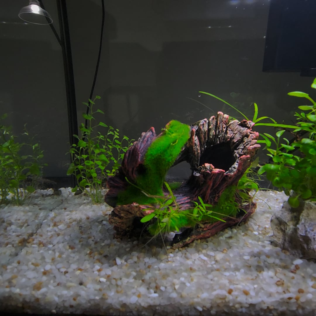 I recommend more hiding places/bushy plants or top-covering plants to block out some light. Bettas natural habitats are pretty dark so bright lights can cause them to spend most the time at a higher stress level, and if he’s catching glimpses of his reflection it’ll be worse ;(