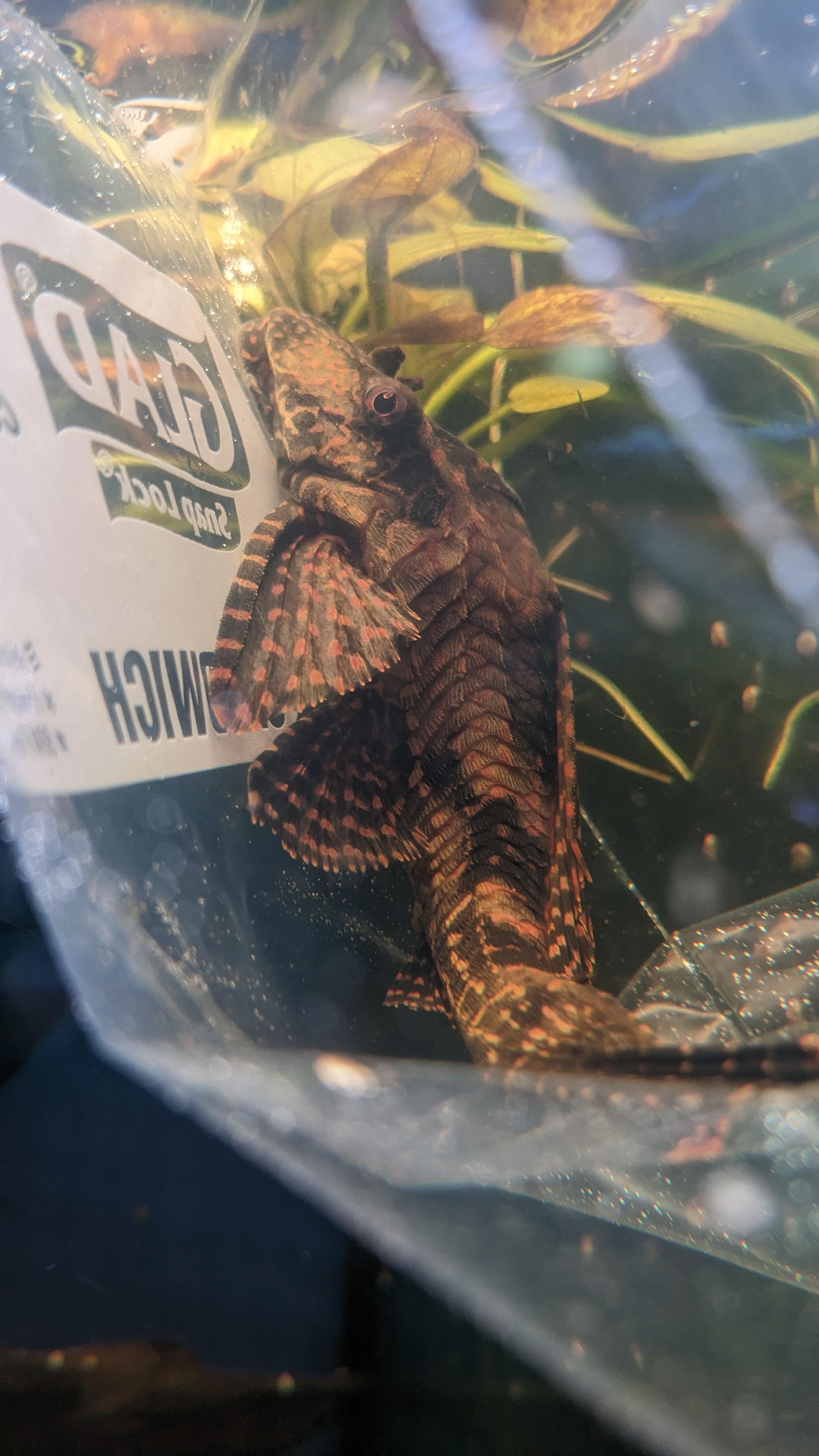 So I got a bunch of fish from a retiring breeder and without ever looking at this pleco in the light I thought it looked like my common and popped it in that tank. I've since decided to separate it to a better lit tank to confirm the ID as it behaves much differently and under the light it's clearly something else, only problem is I've got no idea what. Anybody know what this beautiful little pleco is? P.S. ignore the bag, acclimating to a different tank and slowly increased the light after it went in.
