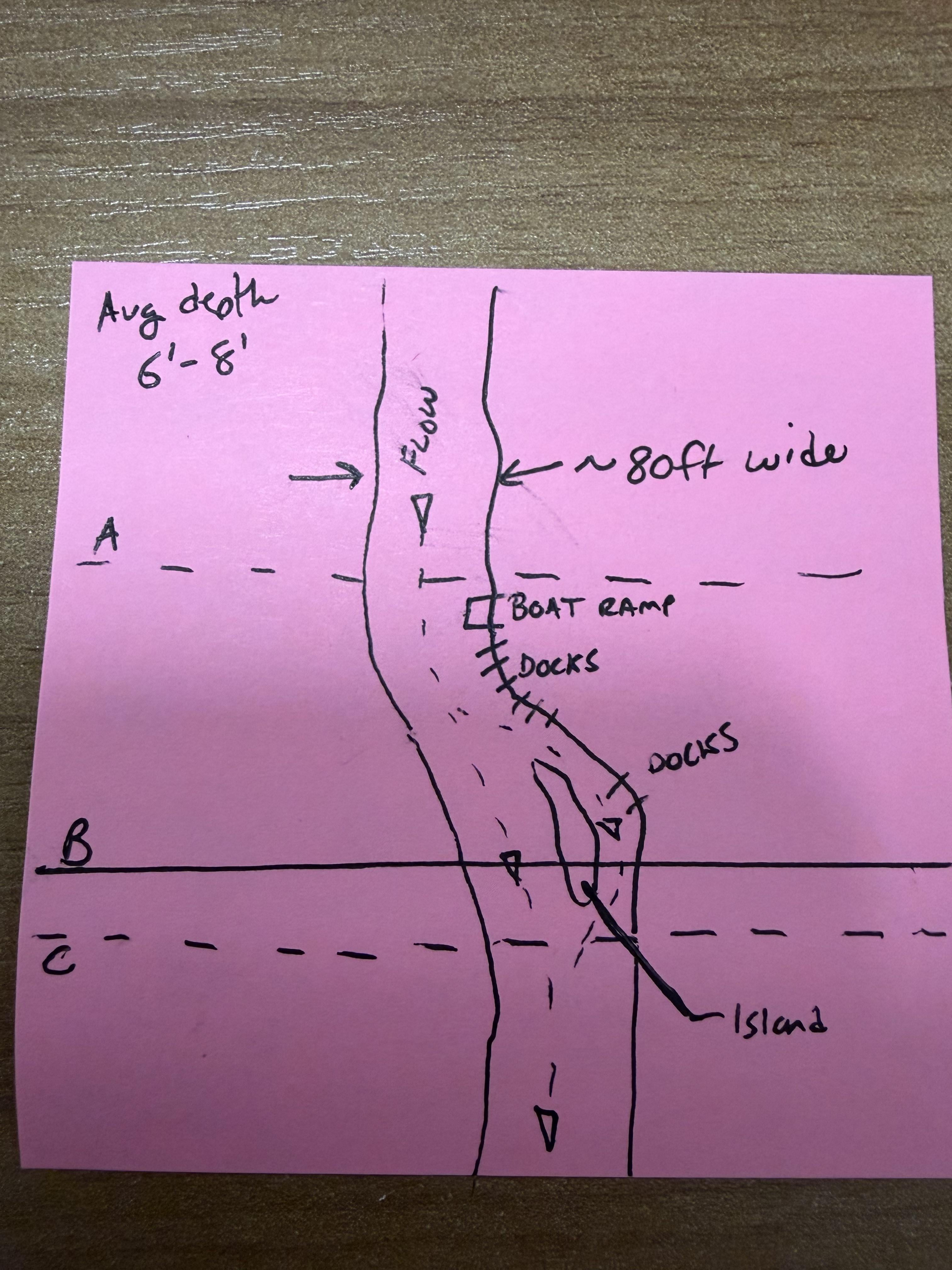 3. Just below island at top of section C. I’d throw my lure up river on right hand side and bring it toward the calmer water below the island.