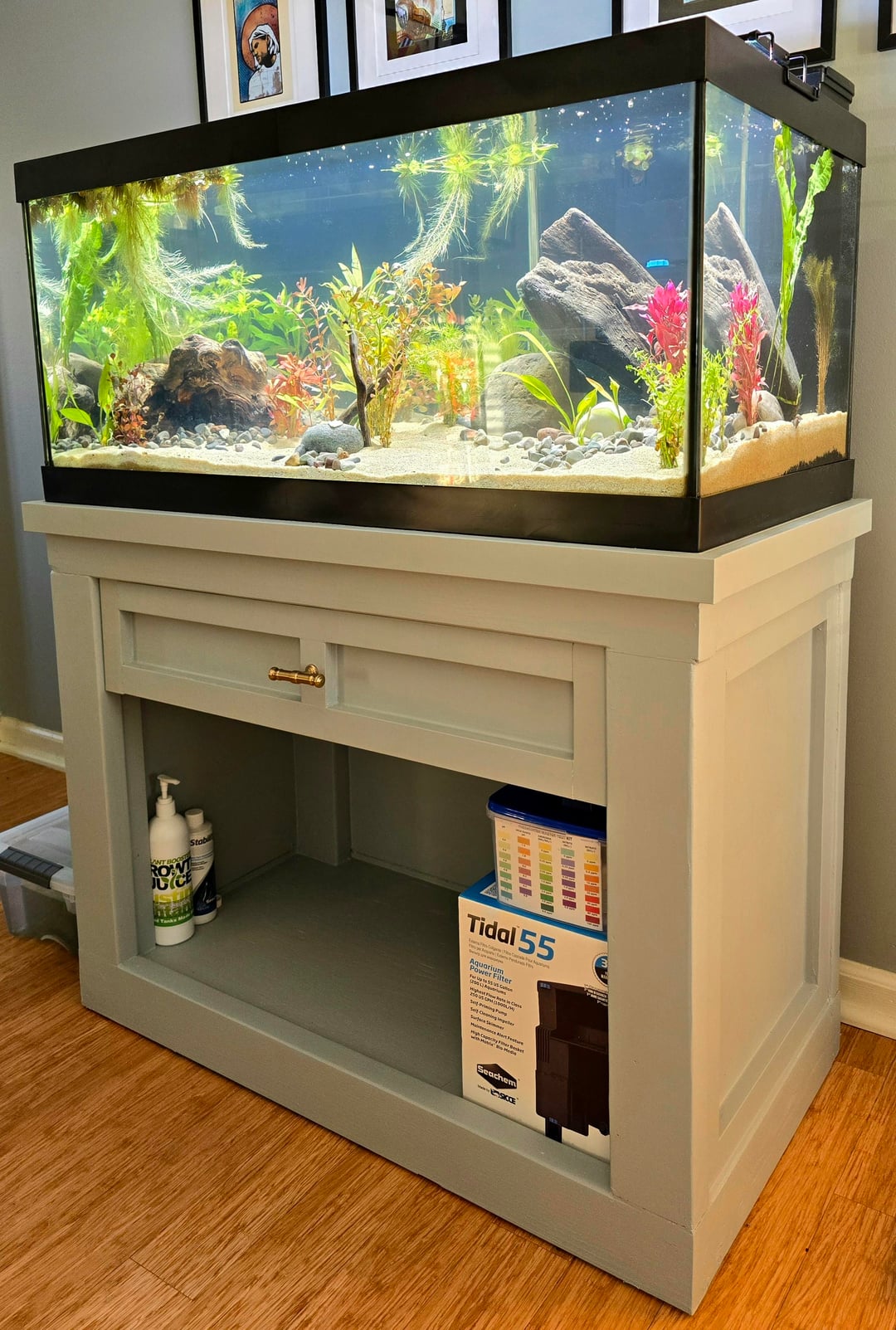 Needed a stand for my new 40g tank, so thought I'd take a stab at building my own. I've seen a lot of other similar examples on here that were helpful for inspiration. General design idea was 40g up top, room for a smaller tank down below, and an enclosed shelf for a power strip and hiding away other various supplies, with a magnetic front panel.