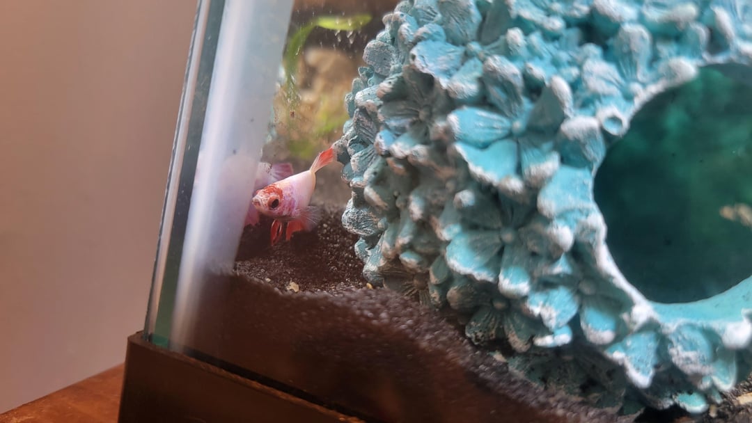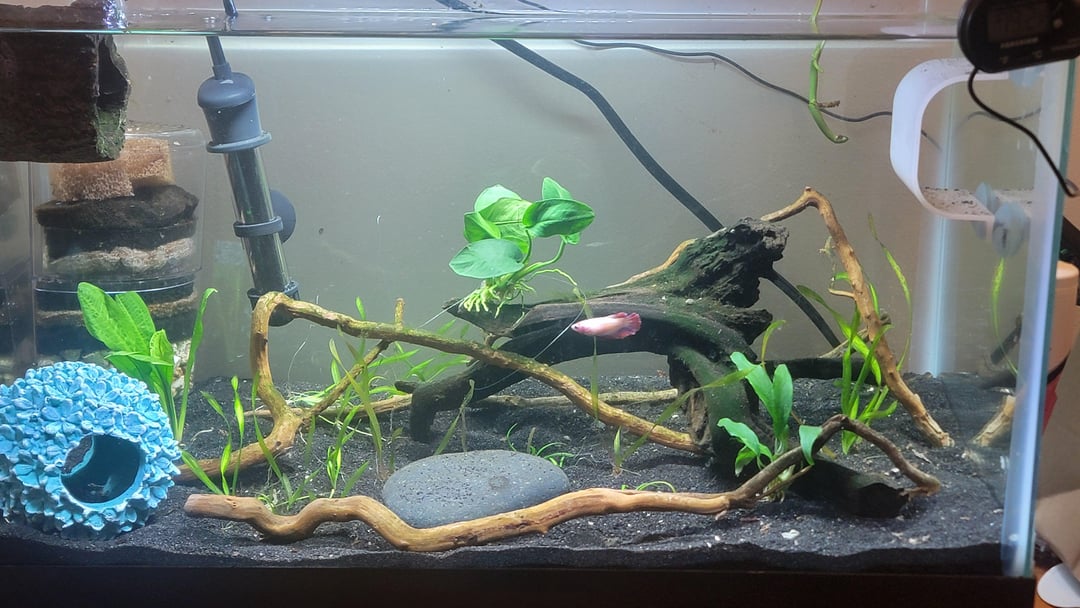 Shes tiny! And so gorgeous. She has this cute white spot/band right behind her gills that wont show up on pics sadly. Also the spot on her head looks like a heart imo. She was originally for my 36g but loved her so much i set my 10g up in my bedroom for her with parts and filter media from the main tank