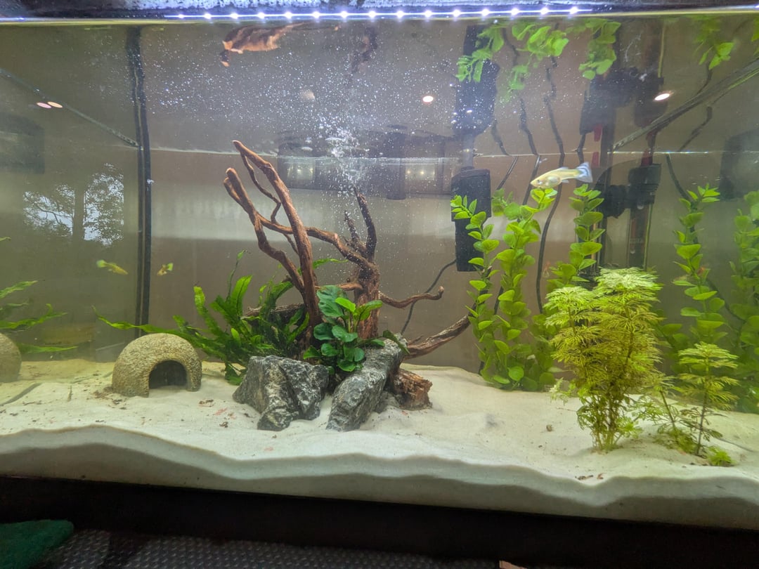 I like the island set up in the middle. More plants are always nice imo. I’d see about getting getting a couple of detritus snails to help with clean up
