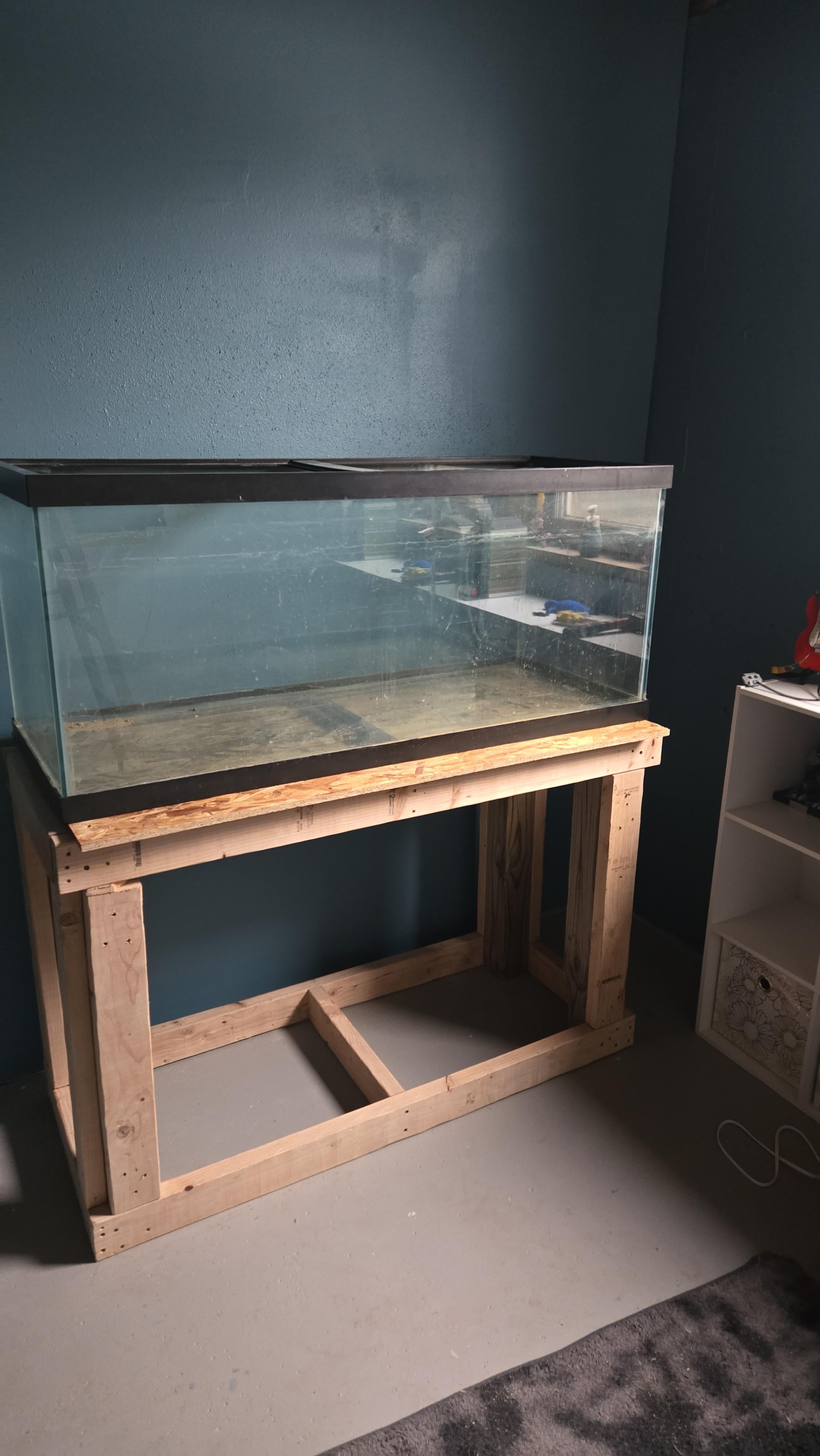 Unless there’s a second 2×4 going across front to back under that osb then the end of the osb looks to be unsupported. Plywood would definitely be a better option instead of osb since osb will degrade faster with moisture. And I would be getting a piece of plywood the size of the stand so you dont have the ends of the plywood unsupported like they appear to be here. Also if it were me, I’d be popping out that vertical 2×4 with the chunk missing at the top and replacing it. But the overall design of the stand is strong enough to hold the tank. I would just be correcting those couple things
