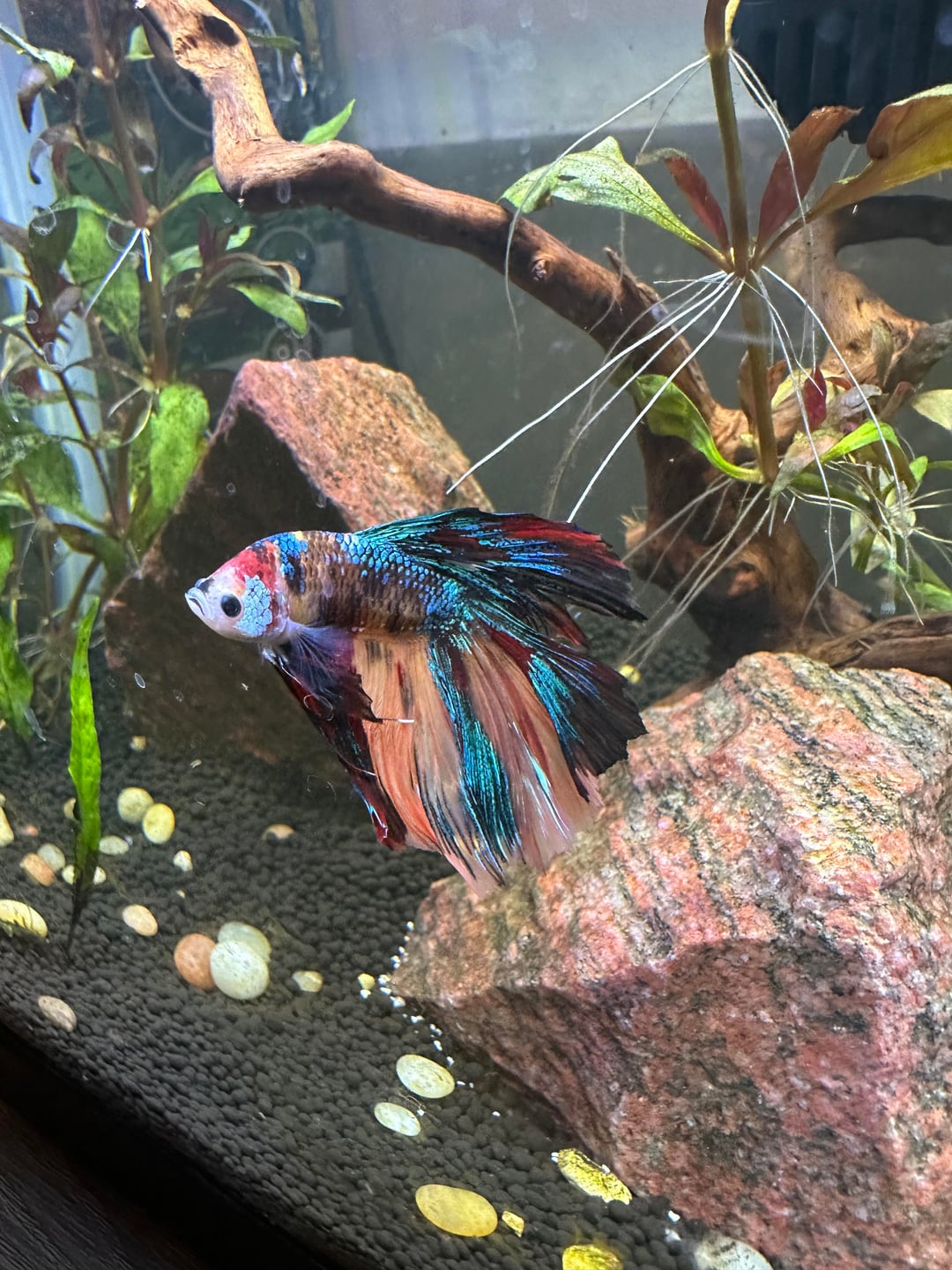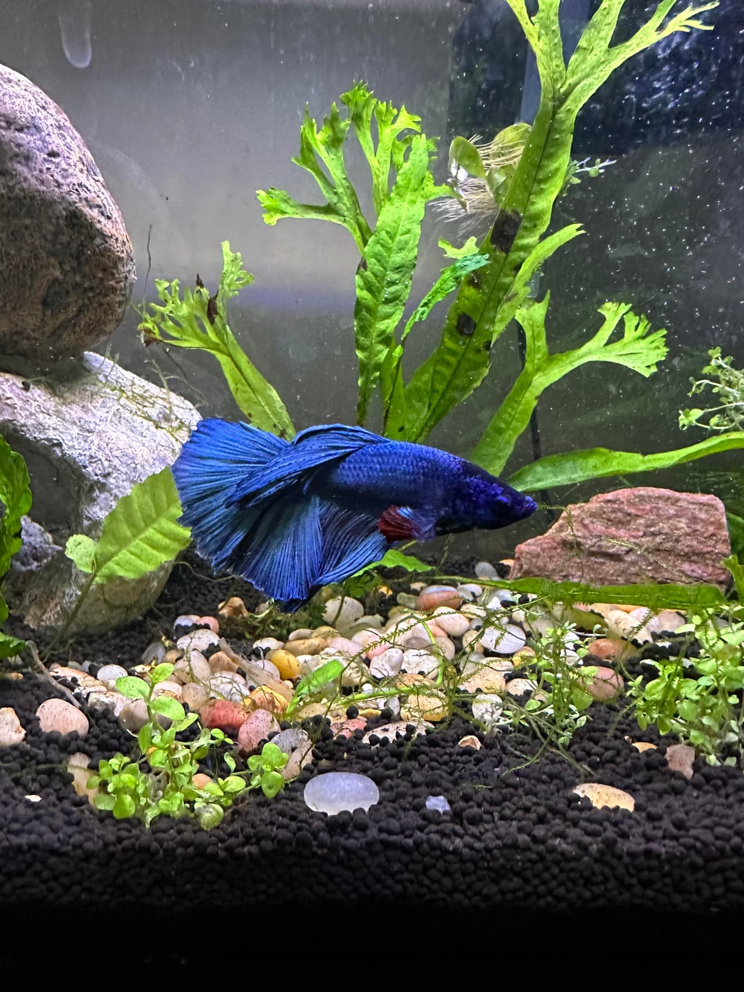 I also have another betta (a delta) named Steve Jr. He is named after my late betta who passed while I was on vacation from a sudden pH crash. I learned from experience that putting new plants in the tank can drain the carbonate in the water. I was able to fix it with some crushed coral but he unfortunately didn’t make it.