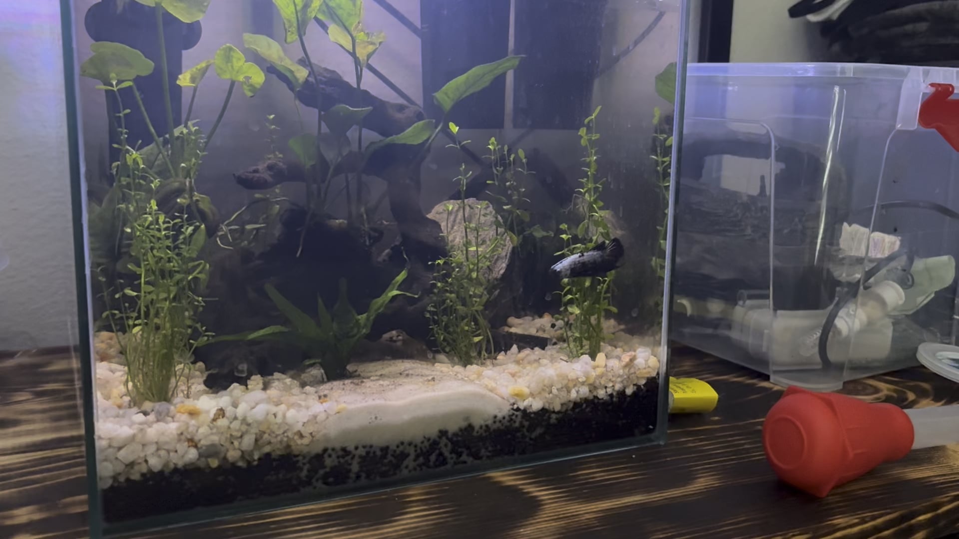 Hello, I got this samurai betta about 2 days ago. I’m still fairly new to the betta keeping world, I have one other boy who is doing great in a 10 gallon. This samurai betta is in a 6.5 heated and filtered tank, he has a mystery snail tank mate and 7 ghost shrimp. The first day he liked following his shrimp mates around and was curious of his snail friend, last night and all morning he has been glass surfing the front of his tank. His ammonia is 0ppm, his nitrites are 0ppm, and his nitrates are 0ppm. it’s was cycled for a month before adding him in and my reading have been consistent. He is still eating, I am tap training him in the back left of his tank as he is developing diamond eye already. He was flaring last night but I turned down the light and the flaring has stopped, I’m just not sure what is causing this and I feel bad. Is this normal?