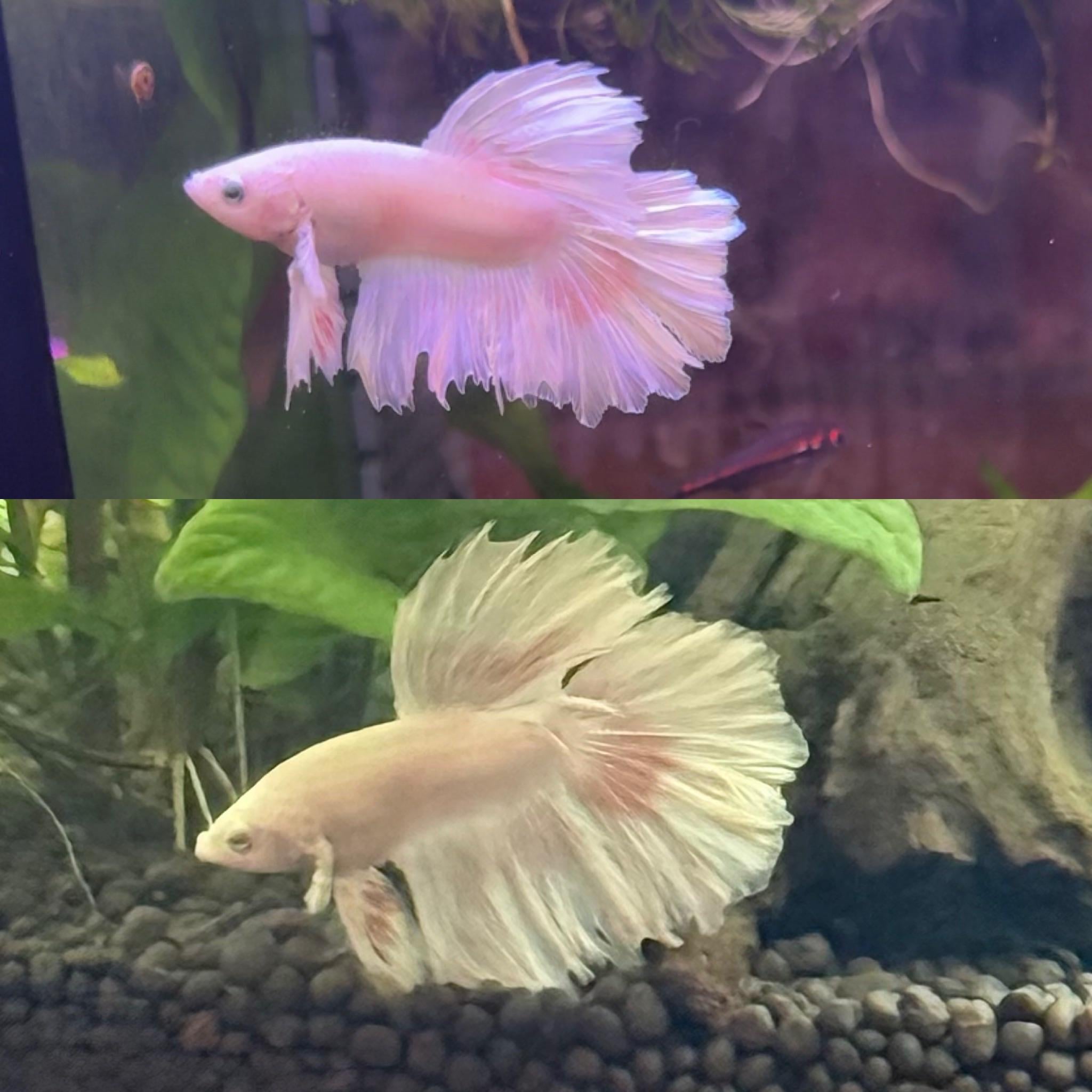Top photo is my betta at my LFS. Bottom photo is him with me after about 3 weeks. Can’t believe how much his tail has grown now he’s not being nipped!