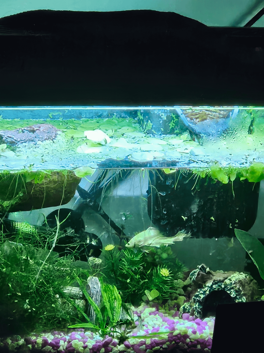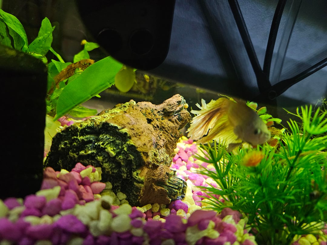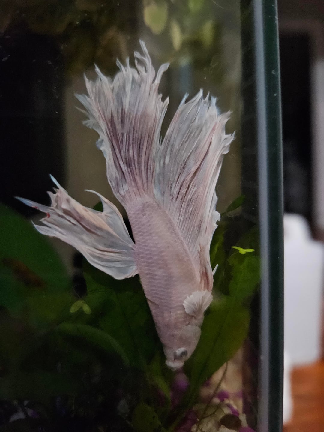 Hi, I posted yesterday night about my betta who Ive had for almost a year. He lives in an almost entirely planted 5 gallon aquarium. I do weekly water changes and the ph is 7.0 yesterday and today which is the only thing I can test without the master test kit (which im buying tonight). Yesterday my betta was super lethargic, barely moving off the floor and not interested in eating. I did a 50% water change since i cant test what exactly is wrong, and I did change the filter which I have since changed back per an awesome commenter's advice. Ive been given some great advice by a commentator that made me aware that he could be bloated from me overfeeding, but Im still trying to rule out other issues just in case. I finally was able to get a good pic of him when he was nose diving and chilling there, and it looks like blood at the end of his fins at the top which I believe is fin rot. Can someone please confirm? Will api bettafix help this?