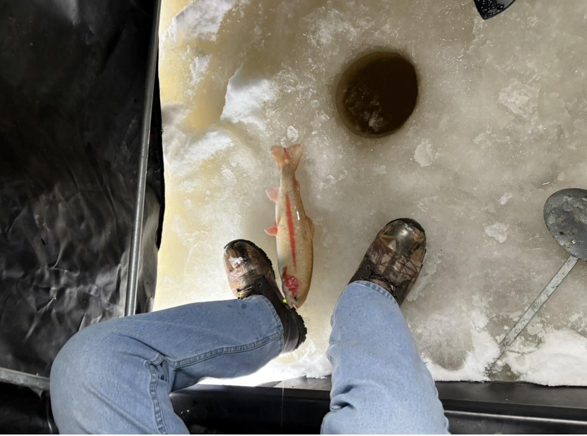 Small jig with a piece of precooked shrimp on it. Minnow tail or worms also work.