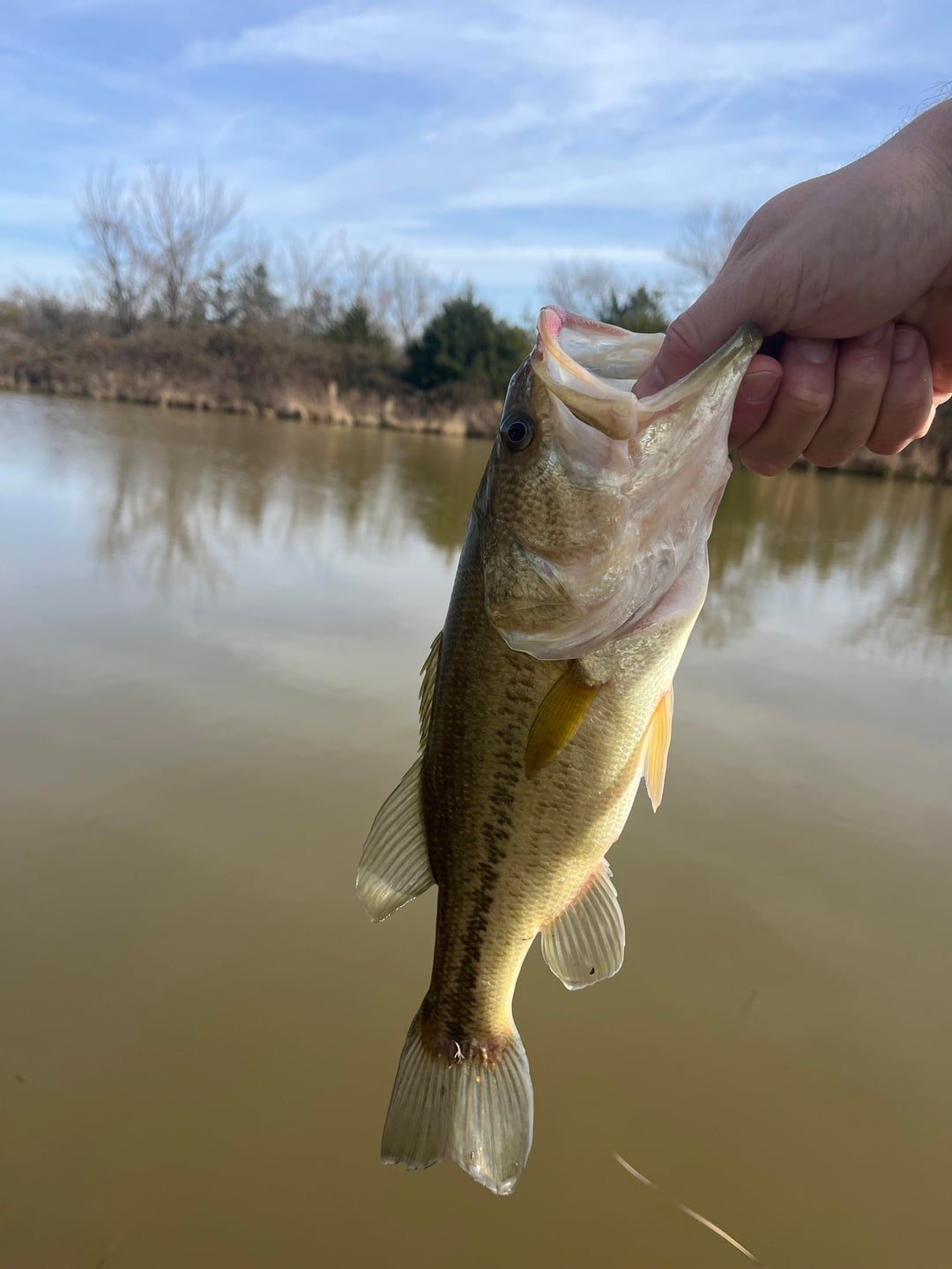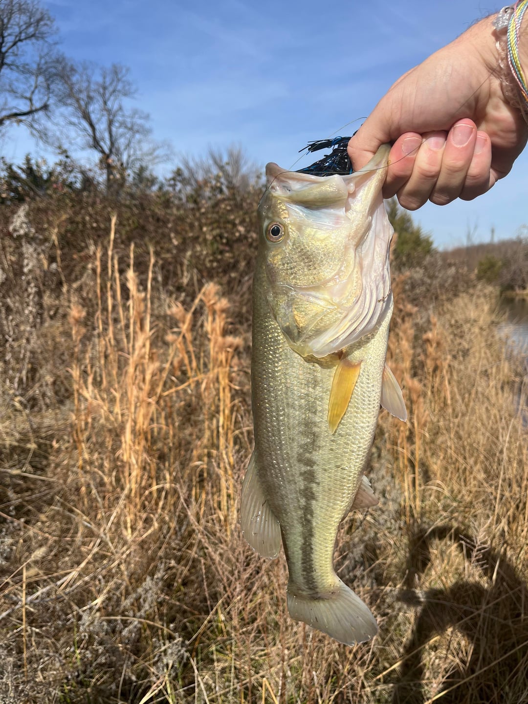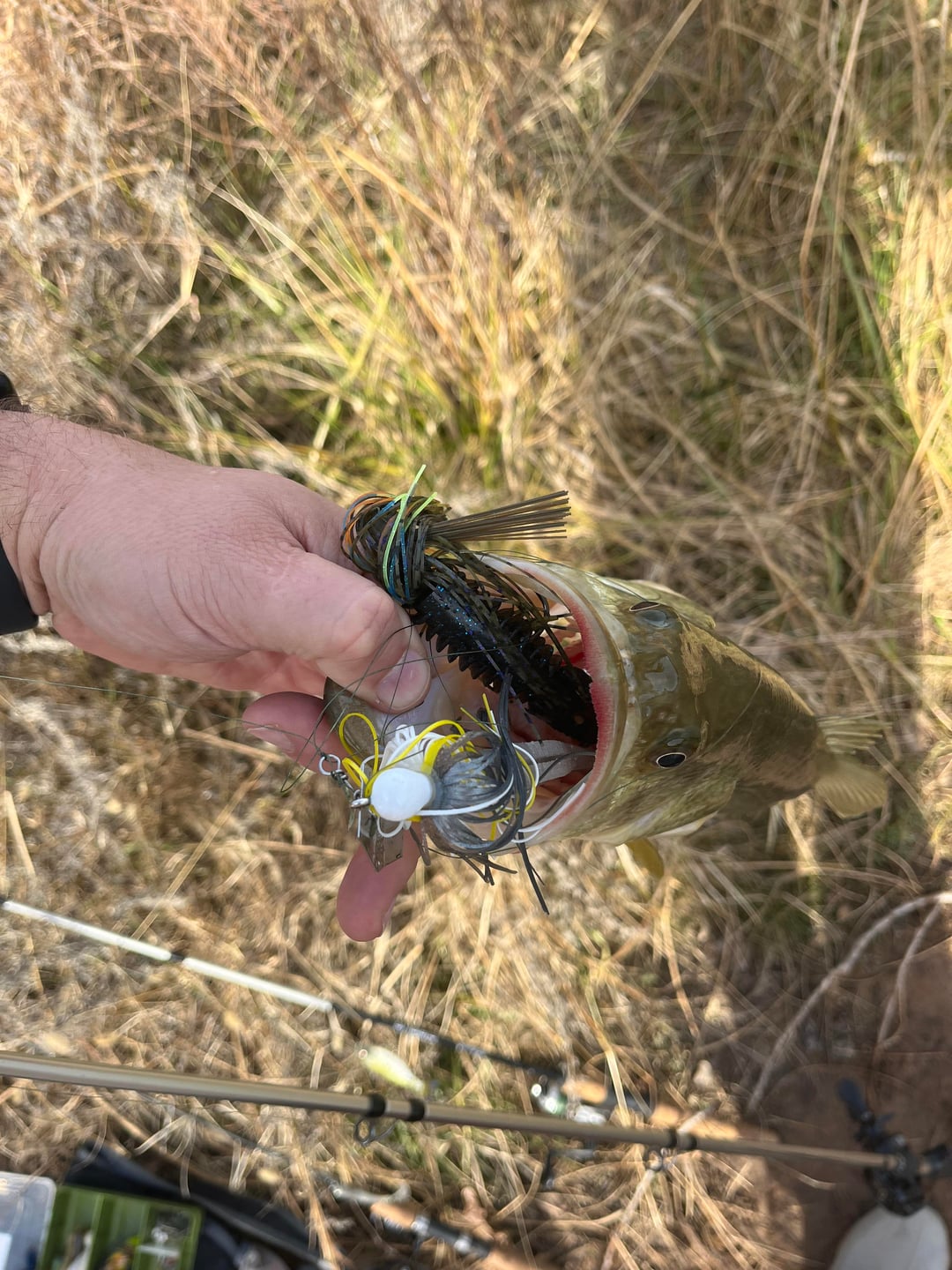 Catch the first one of the day on a black and blue jig. Very next cast line snaps, the jig goes flying!then I tie on a swim jig to drag around, first cast I get a bite, set the hook and the line snaps again. Next I tie on a chatterbait to start dragging around throw it in the exact same spot and get bit again, once I reel him in I see my swim jig still in his mouth, wild sequence of casts. I end up snapping my line for a third time, throwing the chatterbait a little bit later. Overall excited to catch some December fish but I am immediately respooling new line.
