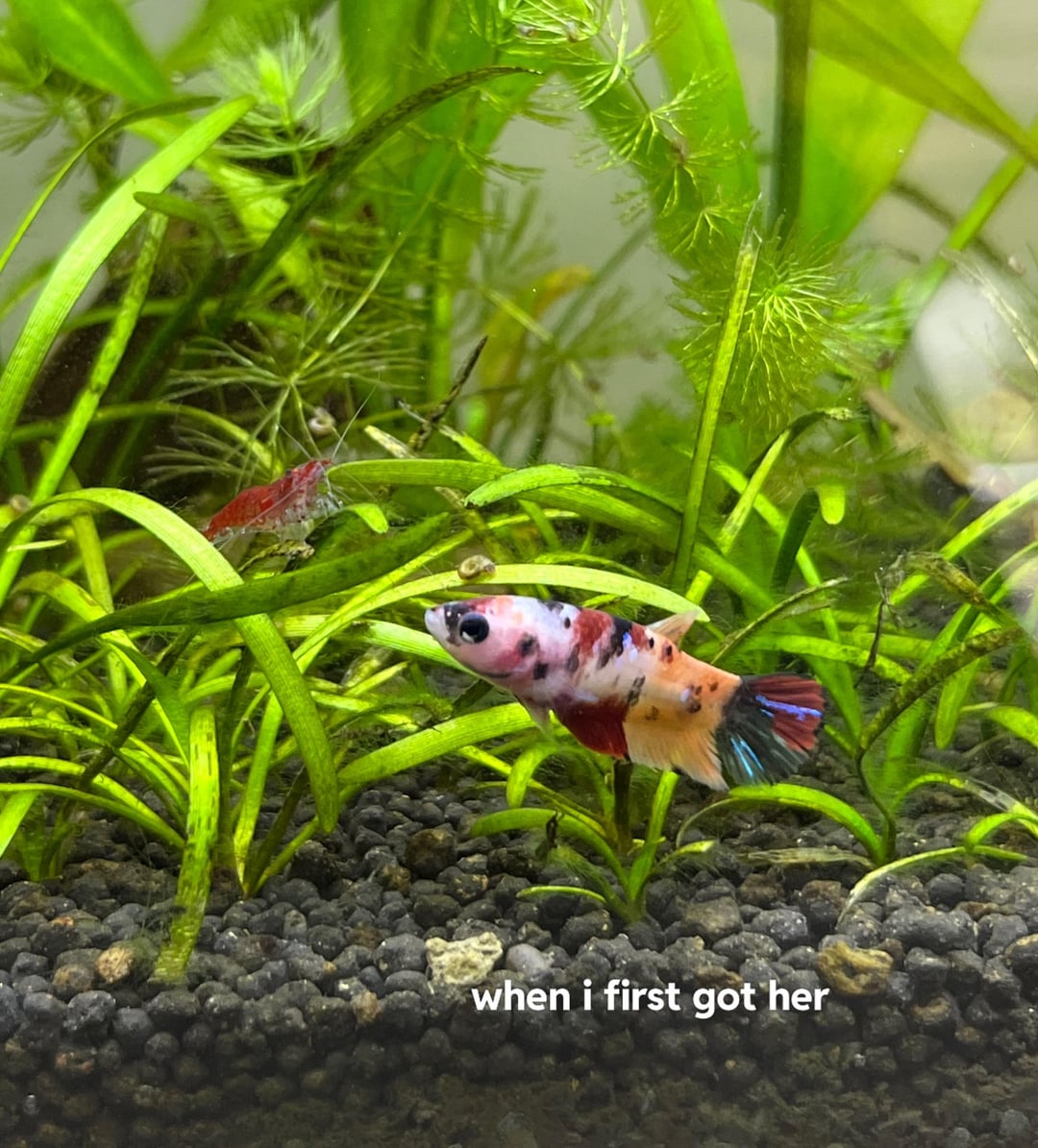 She is very active, explores all day, and has a good appetite. She does her little betta dance when I come to the tank and loves to follow my tweezers everywhere. She gets along well with the rasboras and they even eat together.