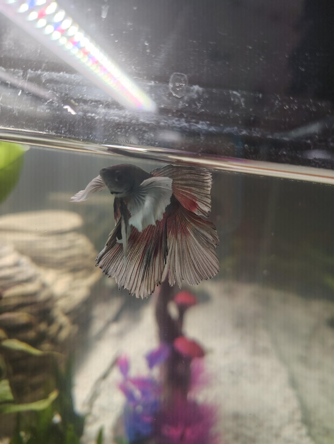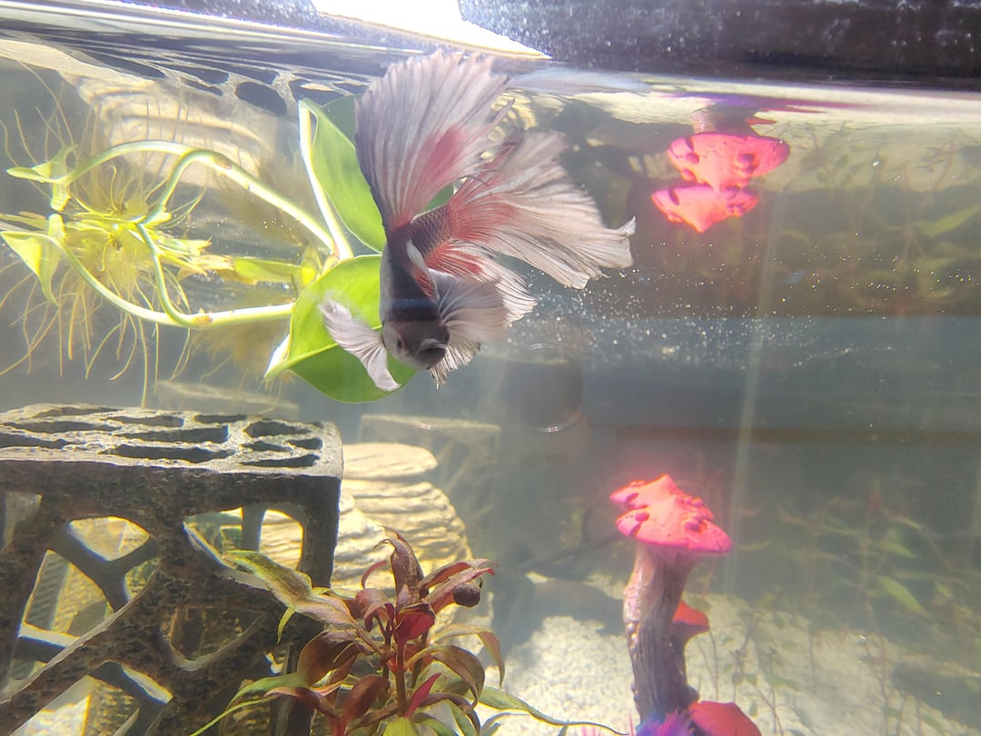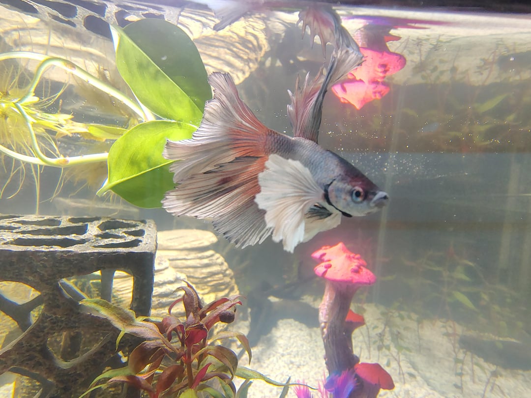 7. I had one too! my Moon was pure white like yours when I first got him (he was sick though, I could tell at the store) but I wanted him to live and give him the best of his days even if he passed young. He was severely malnourished and had a weird perforated/swollen gill but then he turned a beautiful blue sheen and some pink/yellow/reds as he matured – I’ve had him almost 1.5/2 years and he’s still making big bubble nests, attacking random/dumb things in his tank like plants or leaves, mean-mugging on the daily and loving life 🥰 some of these guys just bloom color as they age!