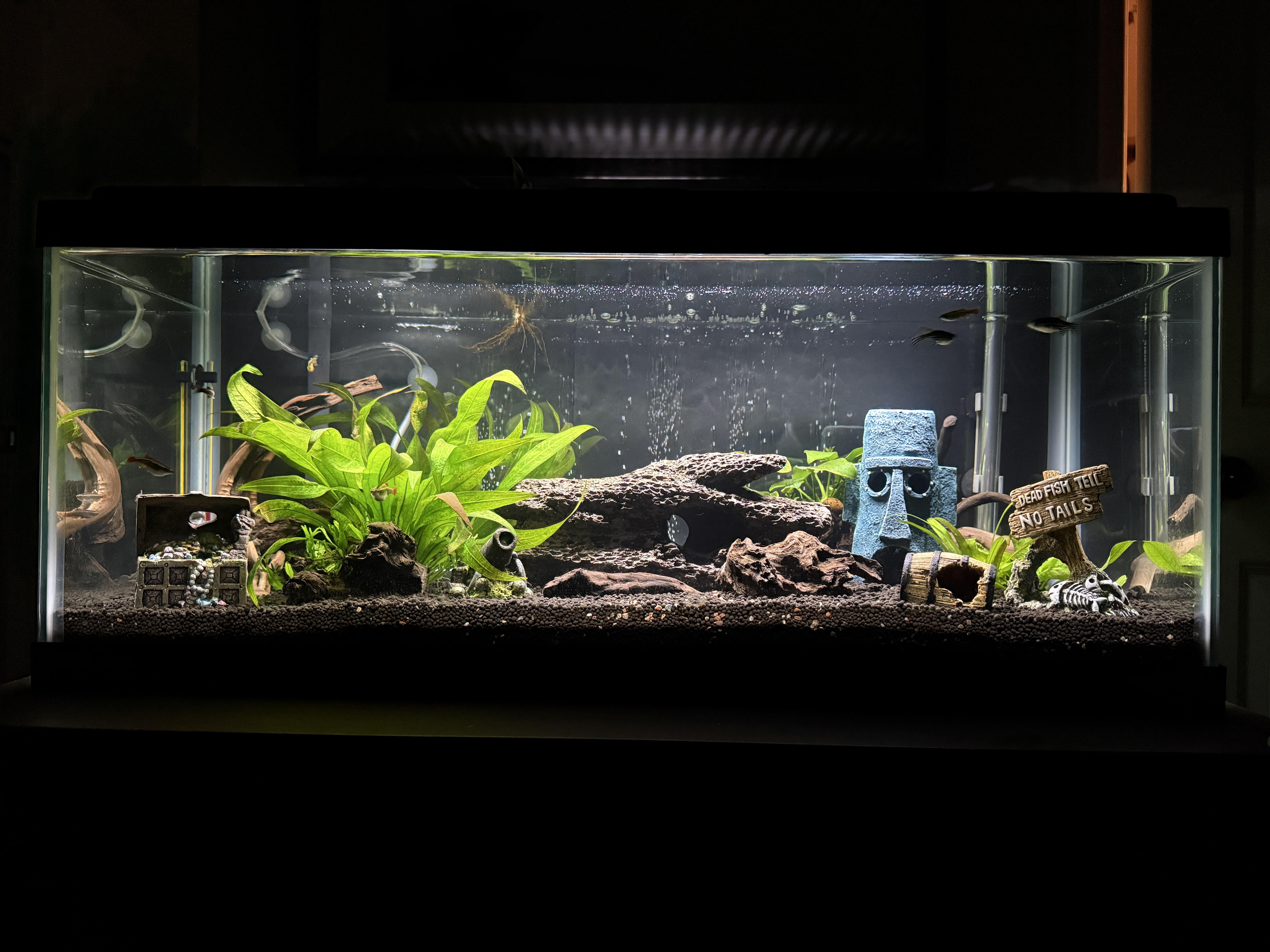 Started 8 months ago with a 10gal tank and I’m hooked. Recently made the switch over to a 20 long. Needs more plants but overall pretty content with it.