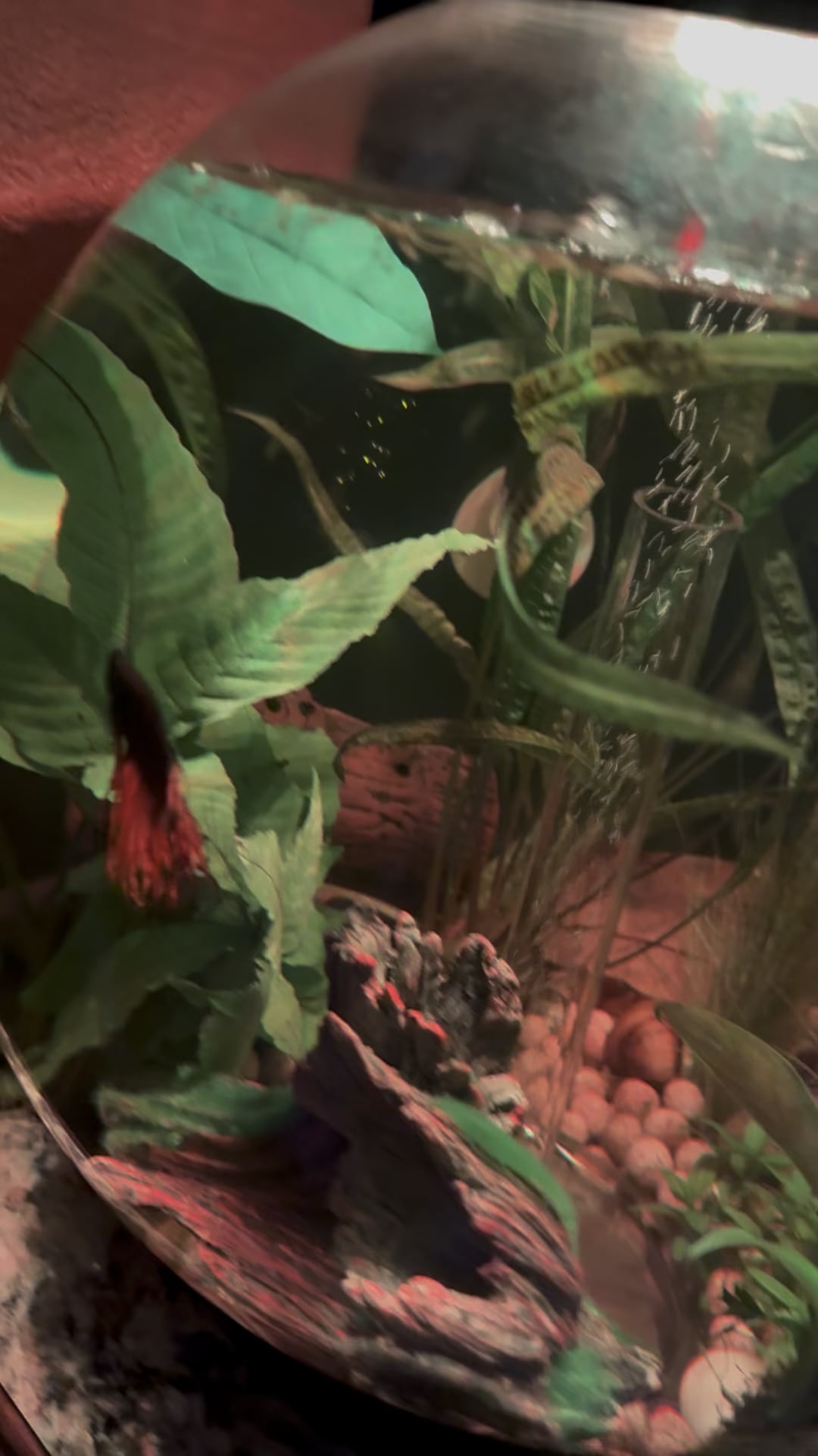 He’s in an 8 gallon BiOrb that has been cycled and established for close to a year now. Our water temp is 78 degrees ferenheit, Ammonia is 0, Nitrites are 0, and nitrates are at 5. PH is 7.2 currently and I just added some chola wood and catappa leaves to lower the PH.