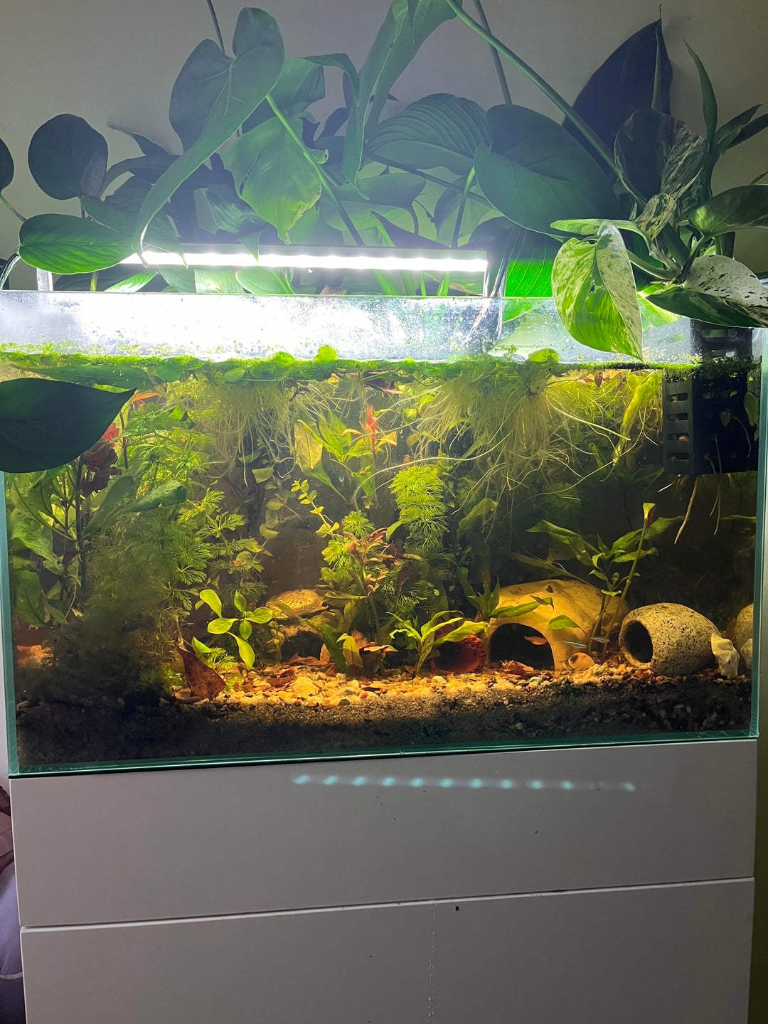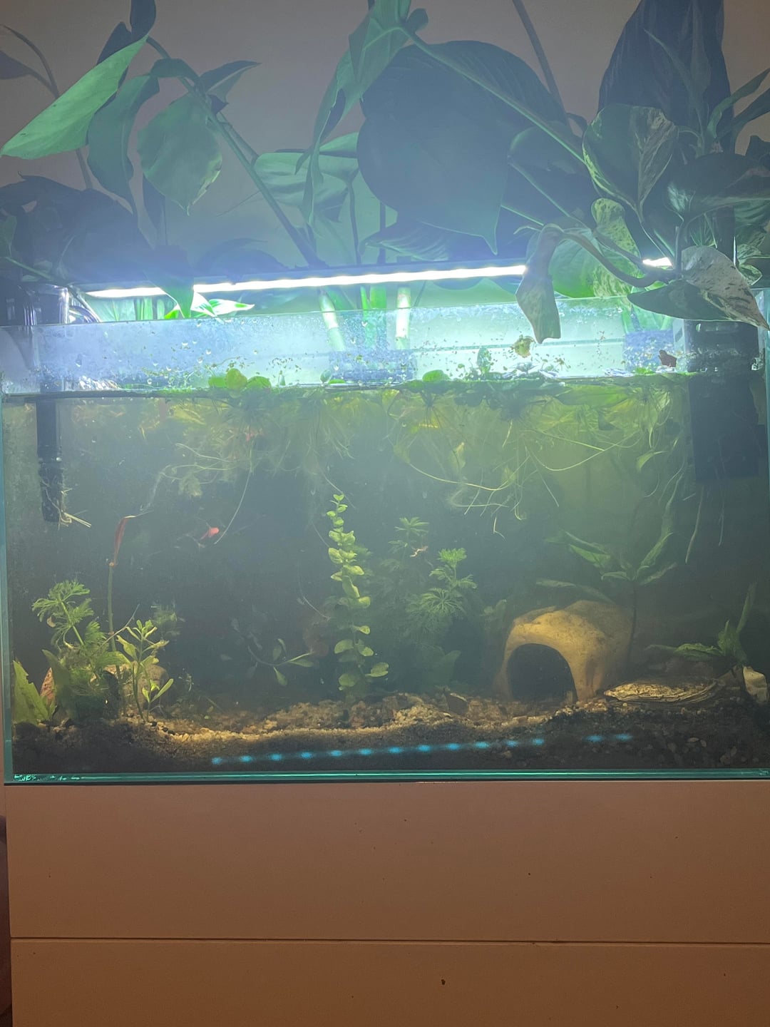 Help I don’t know what has happened, my filter was not working for about two weeks and I woke up this morning with it so cloudy and stinky. So I went to my local fish store and brought a hang in filter and put some of the sponge from my old filter into my new one but the cloudiness won’t go away and my tank reaks. 😭 The second photo is how it was a couple days ago. What do I do??