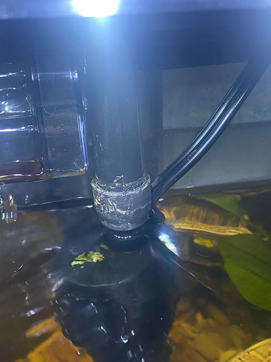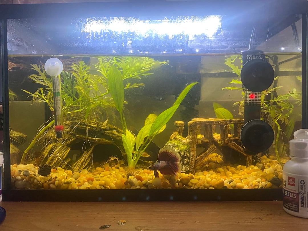 You can float a piece of cabbage on top to attract the snails and remove them. The color is just the driftwood. I would move the fern and heater to the side or back as well as some of the gravel. With only a betta you don’t need to clean gravel, just give it time.