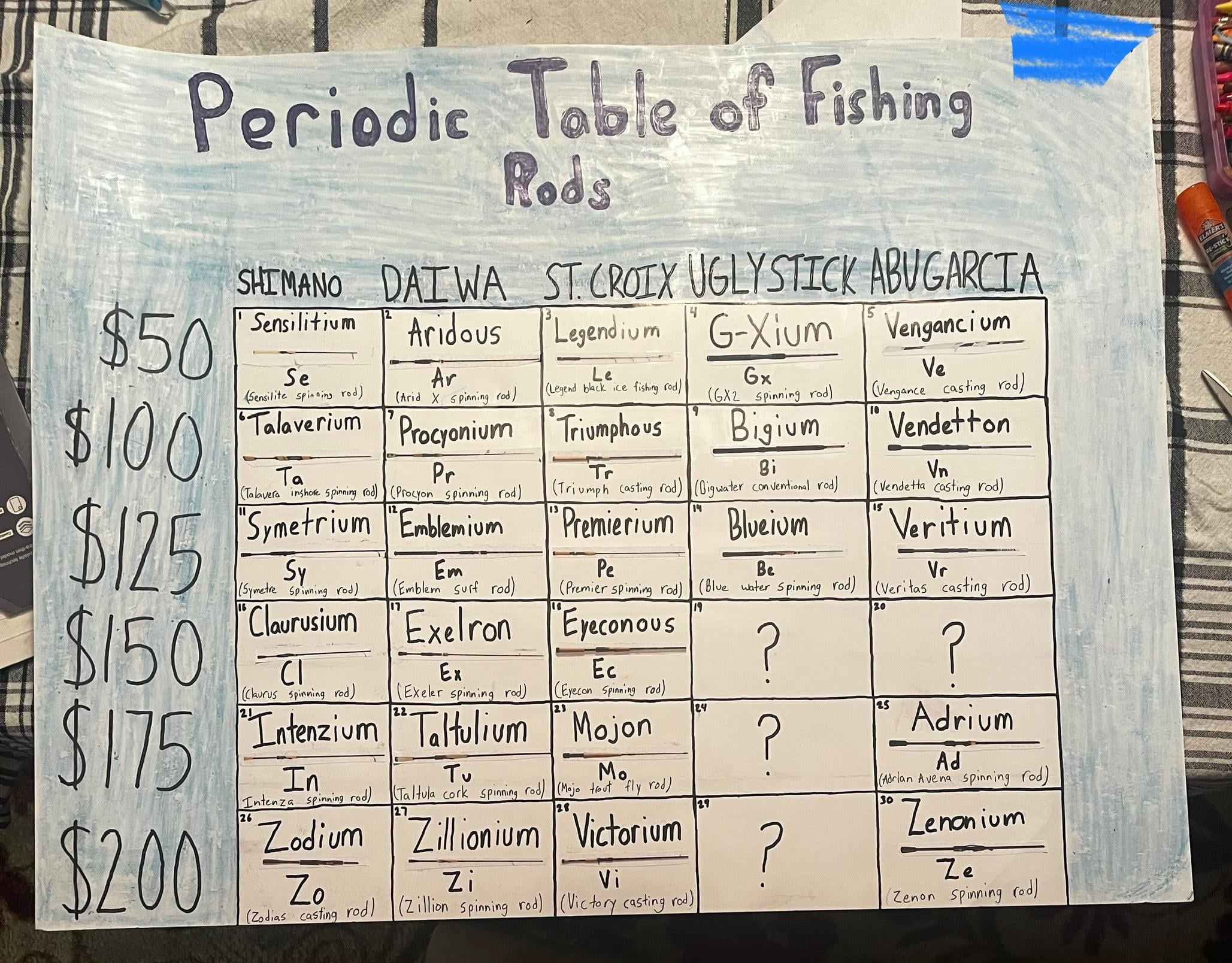 Had a school project on the periodic table and I did mine on fishing rods Posted by Initial-Scheme-9698