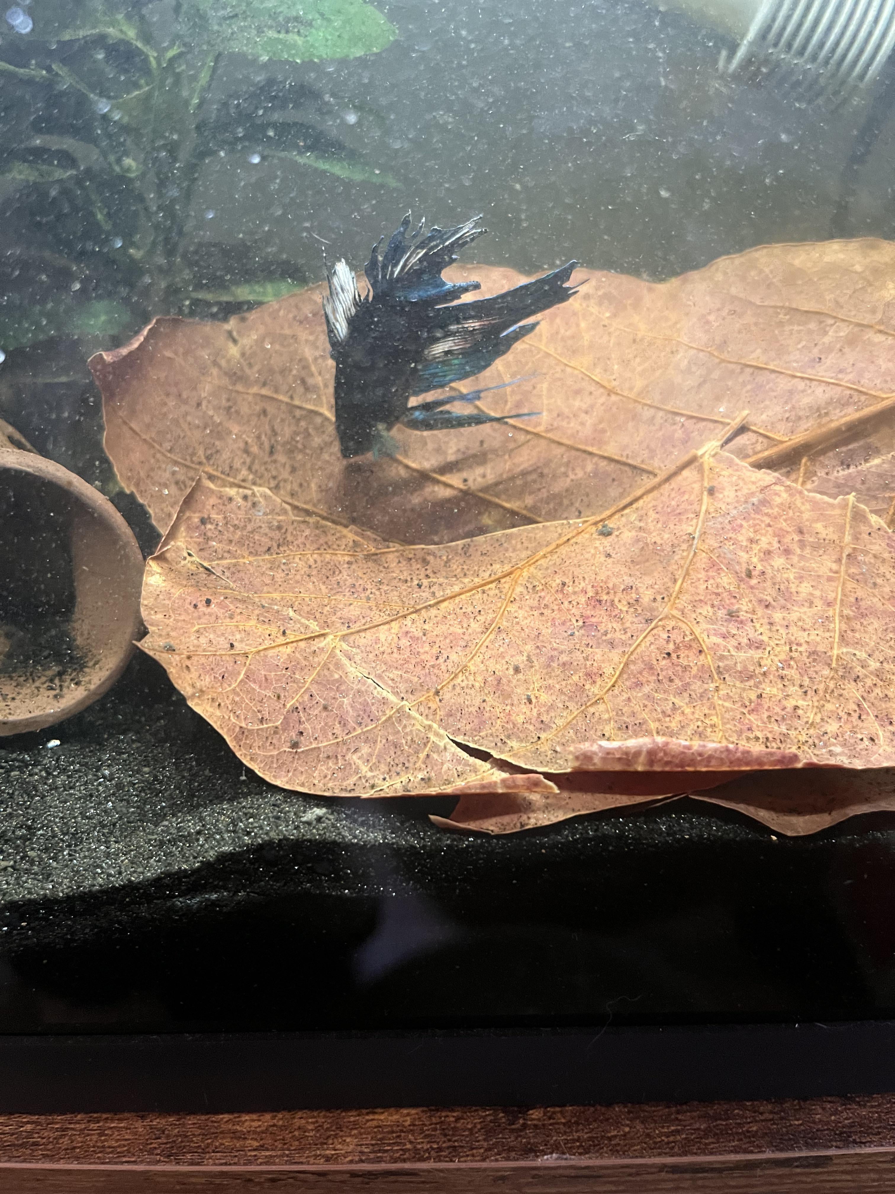 I can’t bring myself to euthanize him because he still acts normal. He has a big appetite (he was eating a piece of food off that leaf in this picture). He’s also active and swims excitedly when someone approaches the tank. He doesn’t glass surf or stay in one corner/ near the bottom of the tank. He’s constantly exploring, begging for food, and just seeming all around happy other than the fact that his fins keep disappearing.