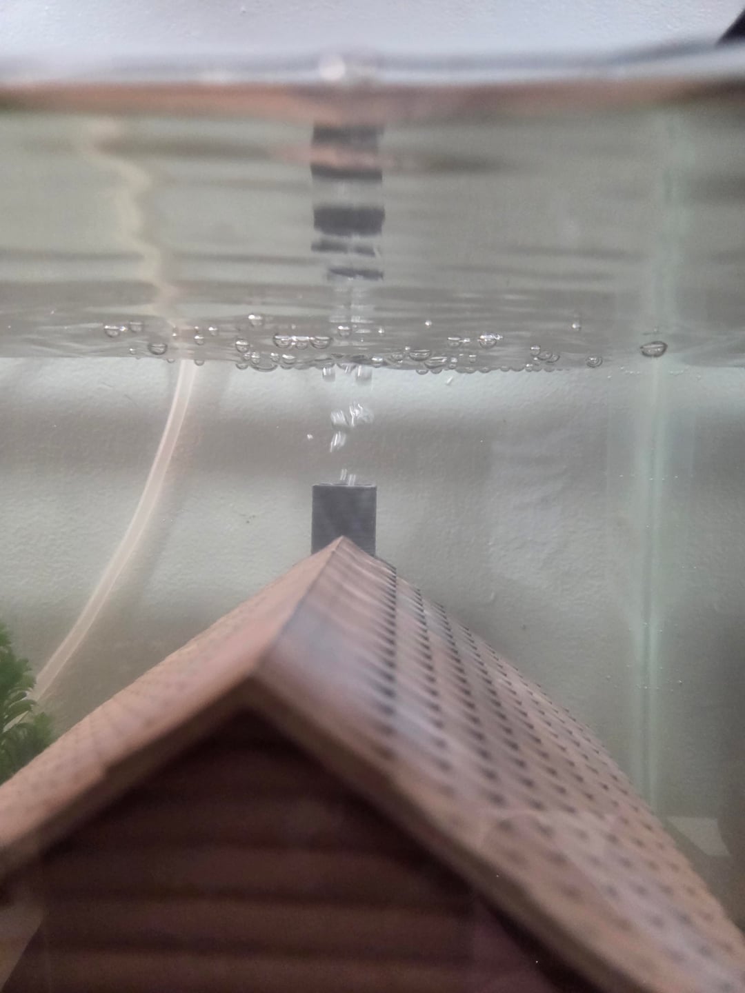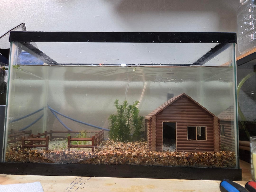 Ok guys, I'm trying to build a 10gal aquarium for my girlfriend. I 3d printed the models, and painted with acrylics (I didn't seal it yet because I wanted to understand the layout better and test the bubble fireplace, but I'm planning on repainting and sealing them, just not happy with the shades.), and put in a few plants to get a better feel for the layout (2 motorcycles (to scale) will go between the garden and the cabin). The plan right now is for it to house shrimp and snails, and be filterless.