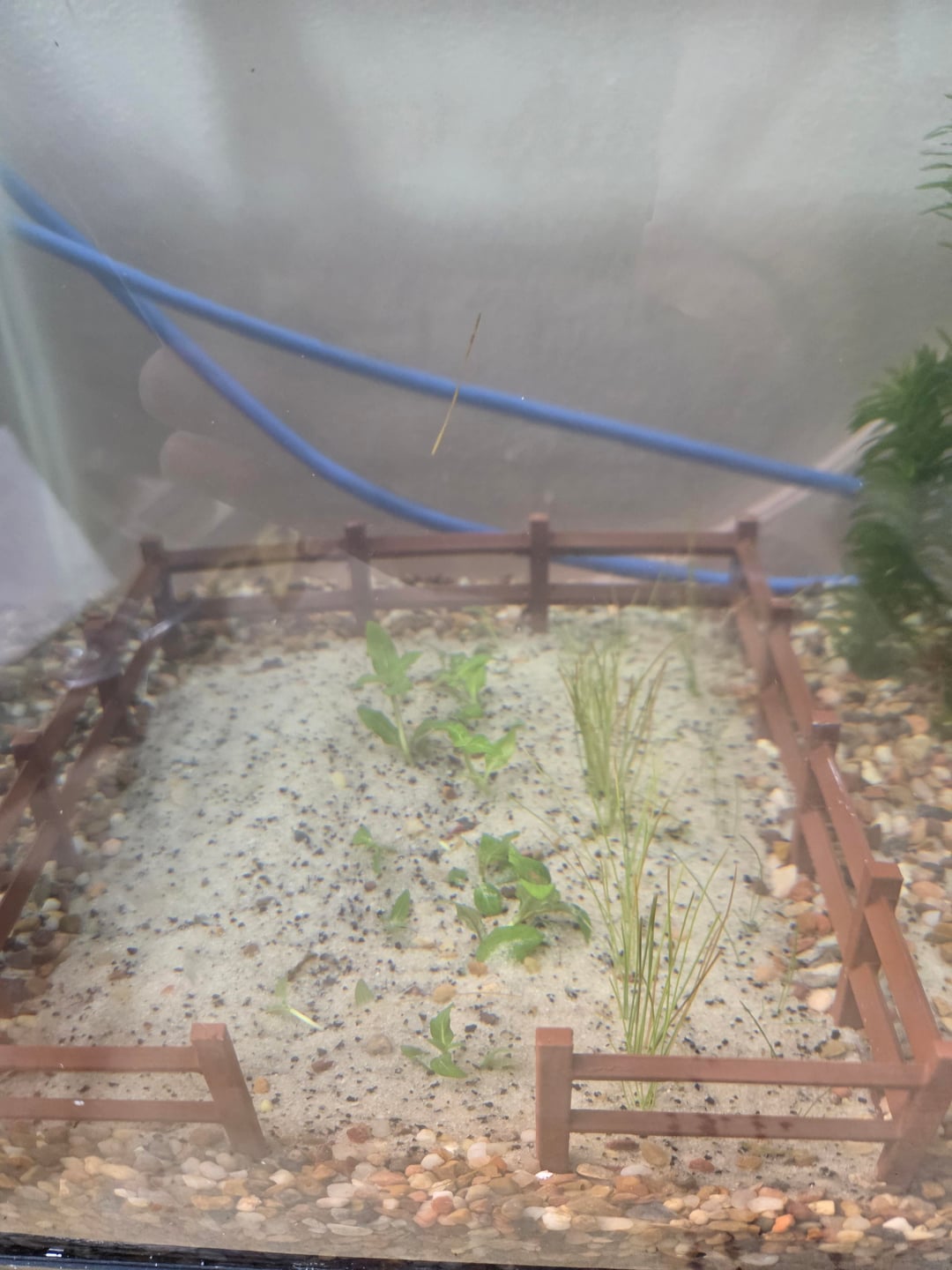 1. The garden had 6 rows of 12 each. I'd like for it to look like an actual garden and not a chaos forest. I don't plan having much bio load in the tank, nor do I want to clutter the side walls (the back can be a full wall of plants, as well as having plants protrud to cover the air line and heater location), but I do want the plants to look good as well as have enough filling capacity to sustain the tank. I will also (hopefully) have a dense layer of Java moss on the roof of the cabin. (Id be open to a tight low dense ground over that could look like grass or something around the edges and between structures, but want to keep the garden area sand.