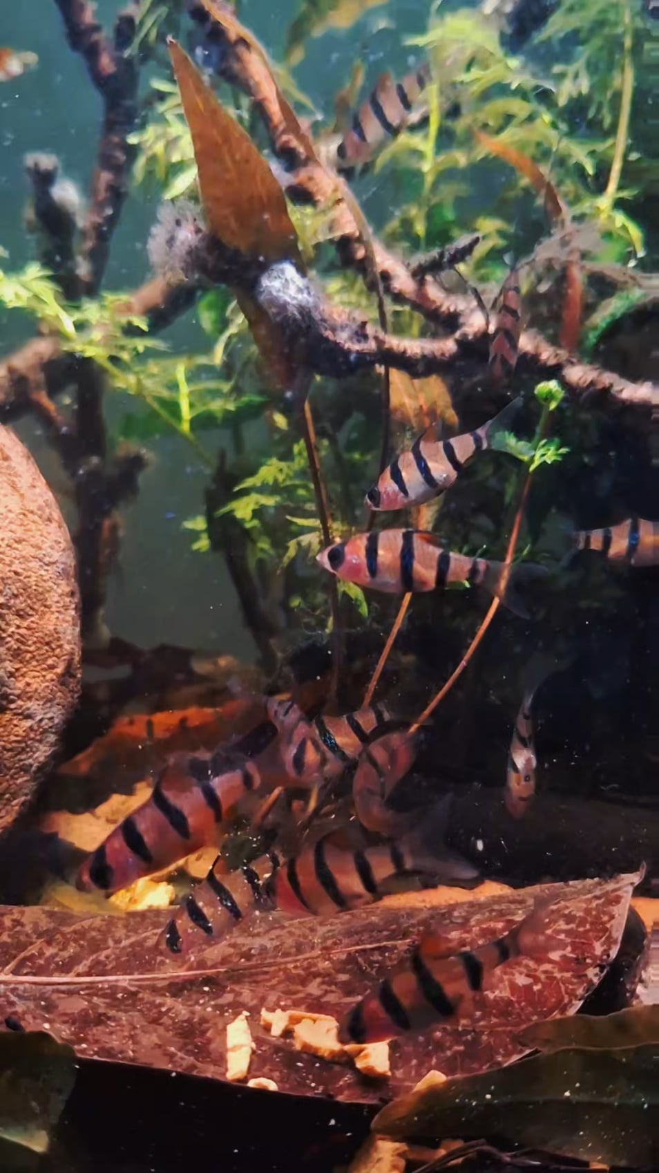 Im loving my new Hexazona barbs (Desmopuntius hexazona). When they were in store, they were pale but when I put them in my blackwater Peninsular Malaysian biotope, their colours nicely saturated. I am aiming to make my aquarium closely resemble their natural habitat.