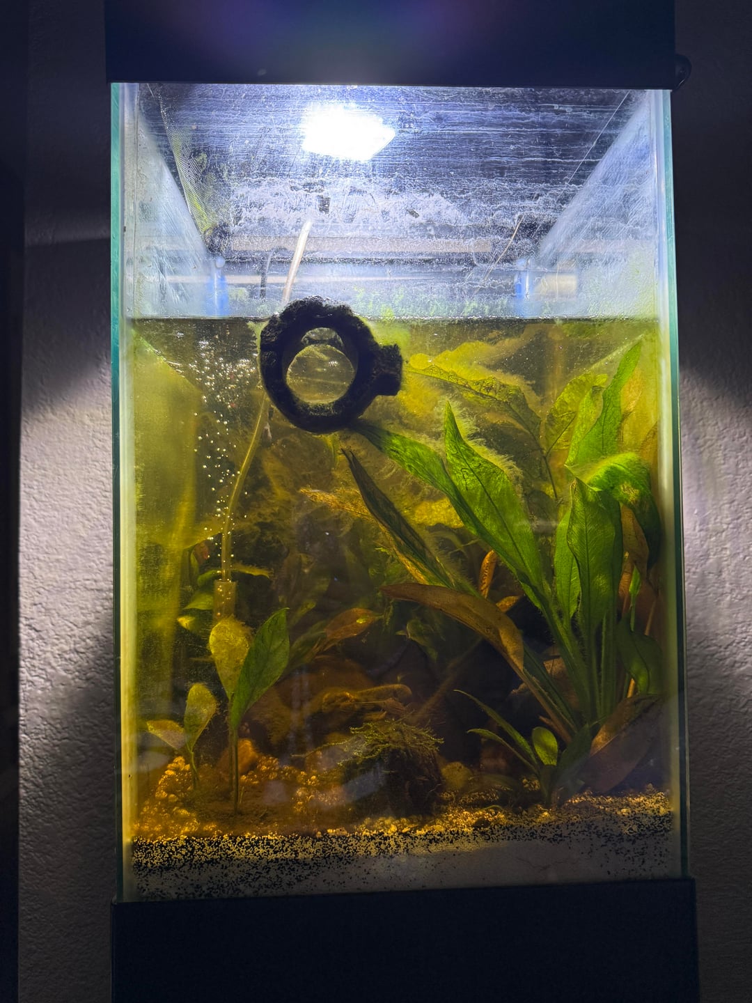 It’s been due for a water change for about three months. He’s in a 10 gallon tank with a small speckled catfish and the plants look like they’re dying and there’s lots of algae on the floor.