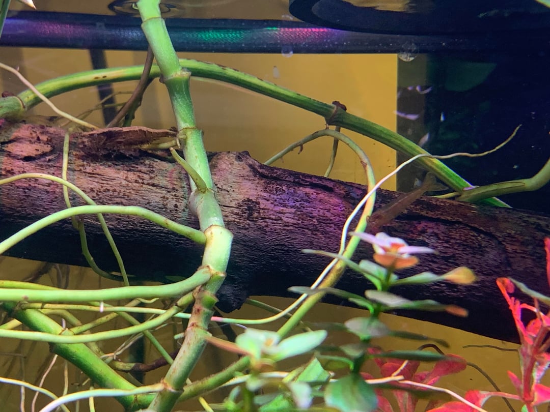sometime in late September I noticed one of my amano shrimp was preparing to drop her eggs. The fry require a saltwater transfer if they’re going to survive. In the wild, they’re released in stream grow up in the ocean and return to freshwater. I was trying to prepare a saltwater transfer to mimic this, but by the time I was ready momma had dropped and I accepted this would be a project after my semester is over. Come October, I see a small fry snacking on a dead leaf (similar to size seen in pic two) and figured it would be a snack for the fish, not expecting it to survive without saltwater.