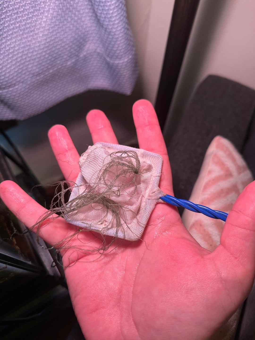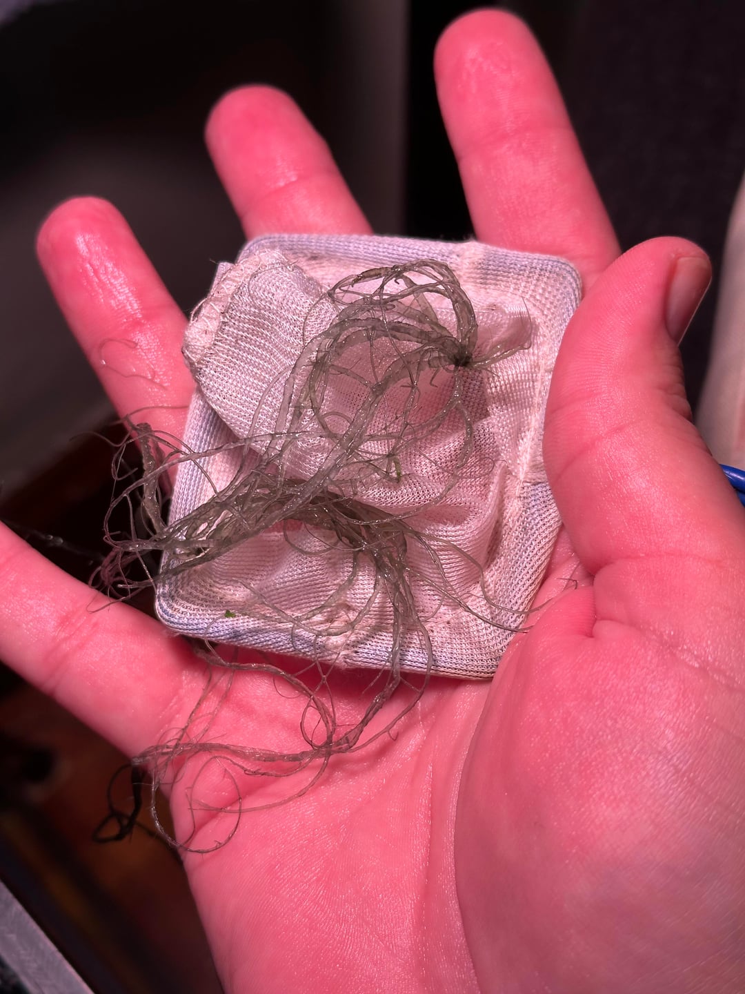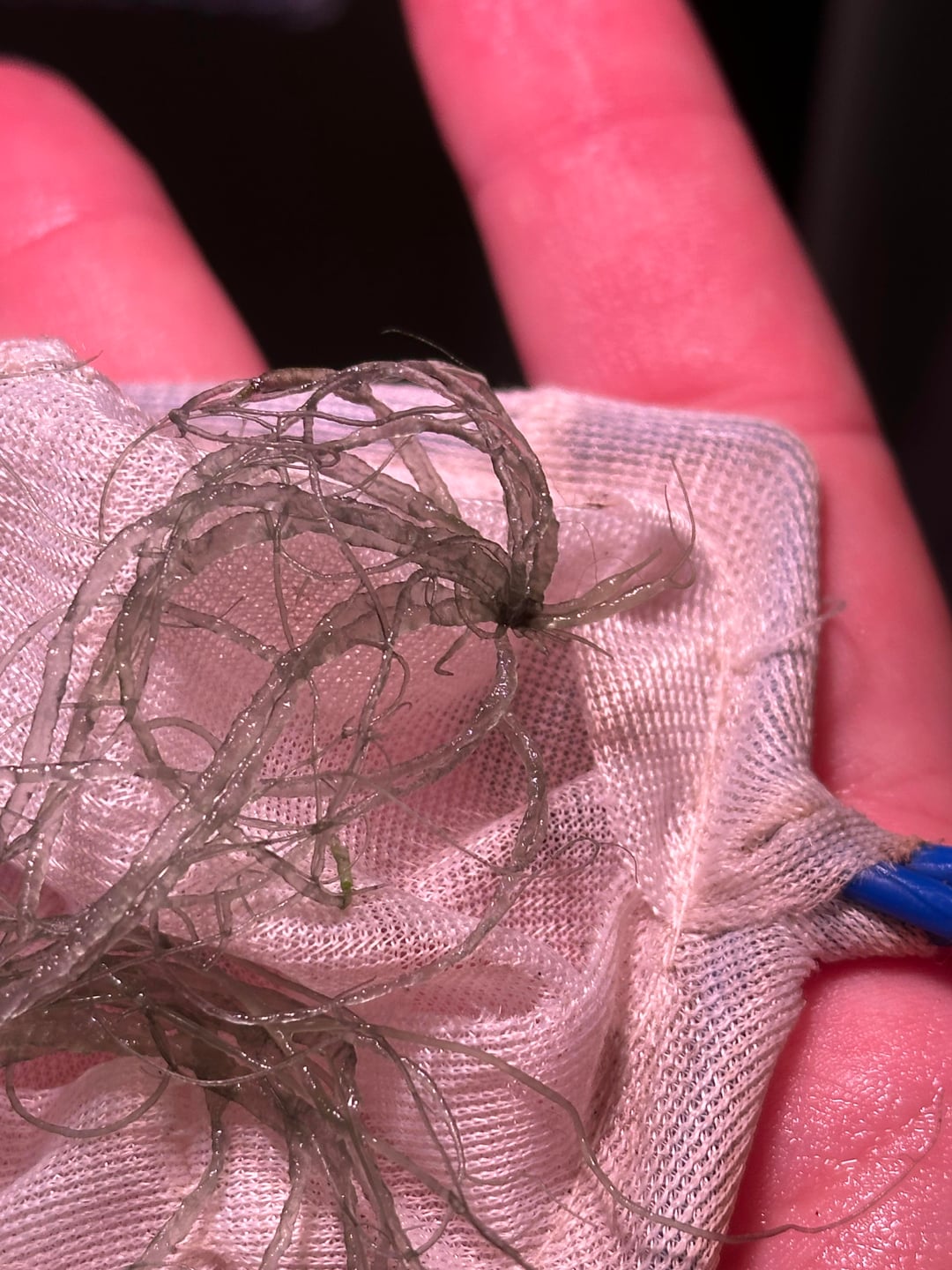 Water seemed to not be flowing from my sponge filter despite bubbles coming out at a good speed. I reached into the tube and pulled out this plant. The tendrils were tough like hornwort stems, and snapped cleanly when pulled without any fibers. The tissue was translucent and jagged. I examined them for stoma like one might find on a carnivorous plant, but didn't see any. You’ll also note that the plant seems to have a central node from which the tendrils extend.