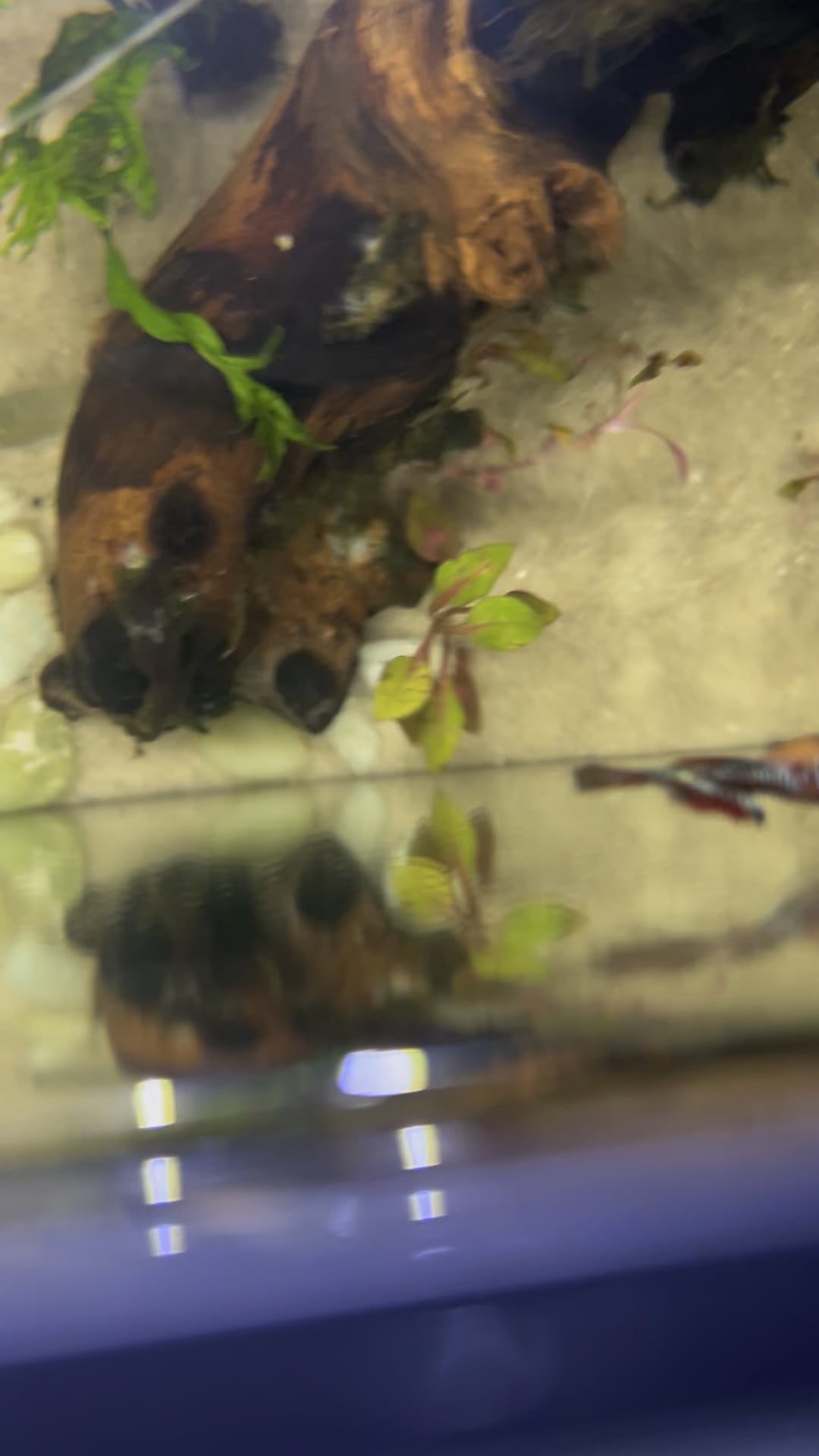 Ive had her for around a month now. She was originally in a 5 gallon tank where I was using a mounted grow light instead of the one attached to the lid since I did not have the cord for it. I thought maybe the light hitting the glass at an angle was causing her to see her reflection despite it being turned down very dim. Other details that might have affected her stress levels in her first tank was the preset heater that was holding the water around 72° and the filter caused a current on the right side of the tank.