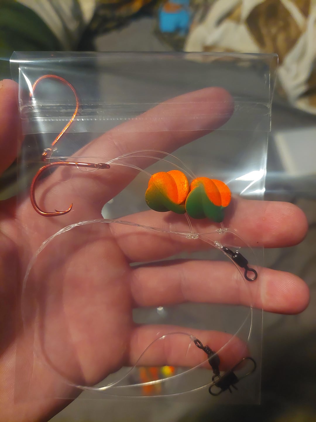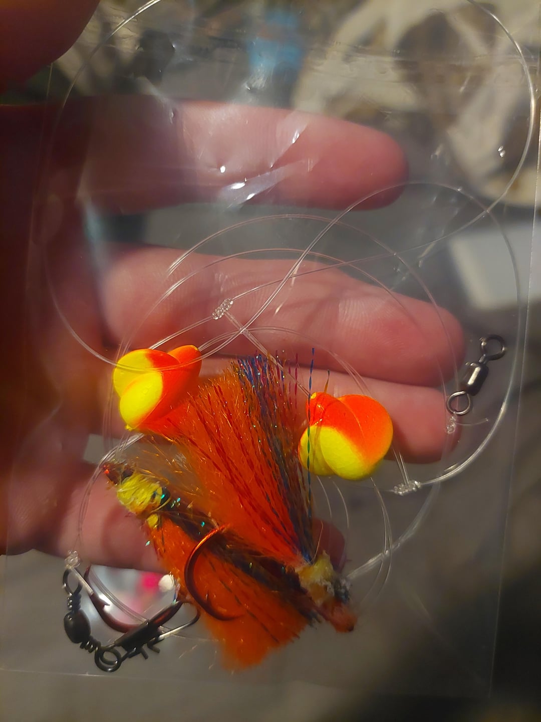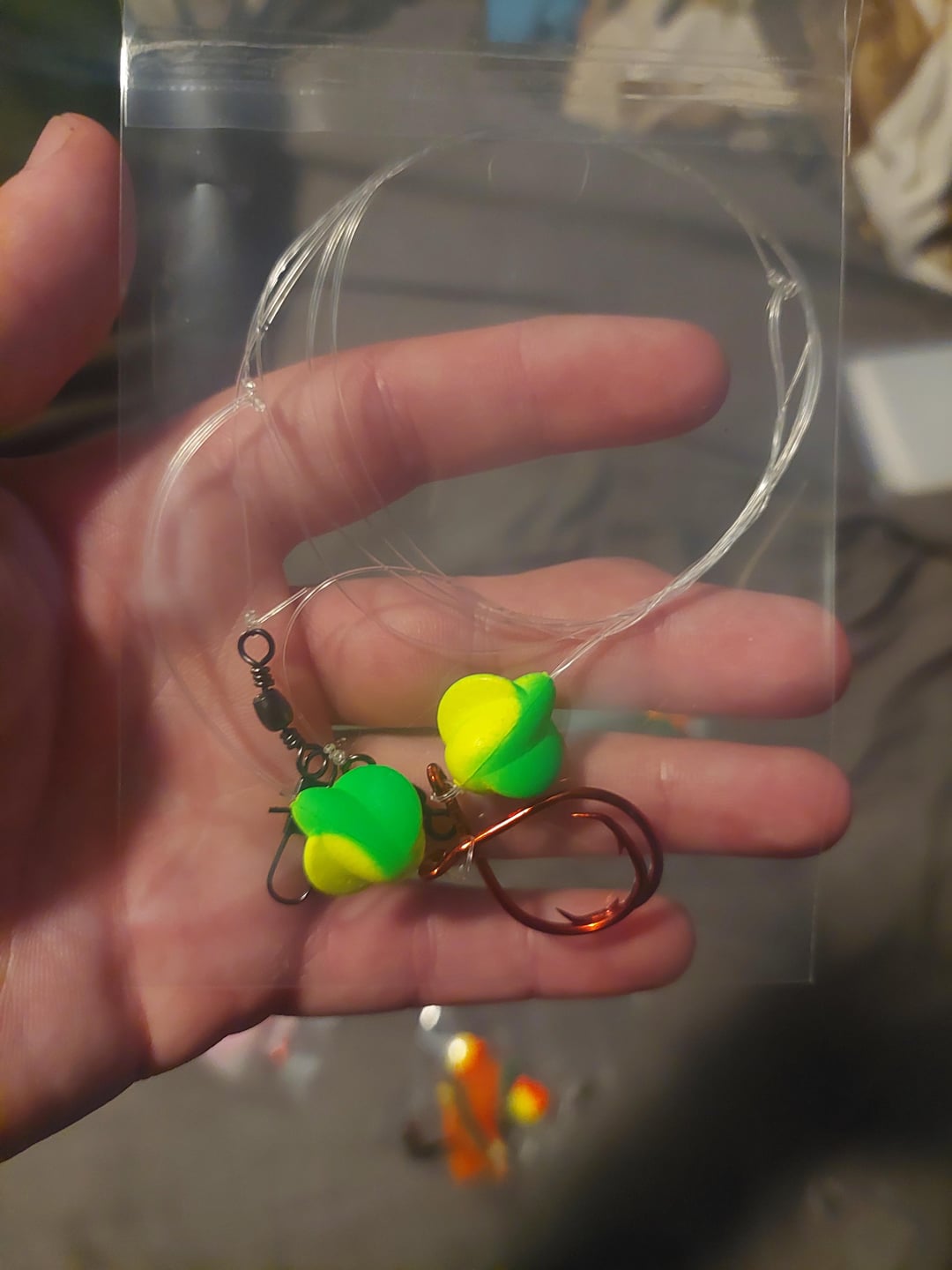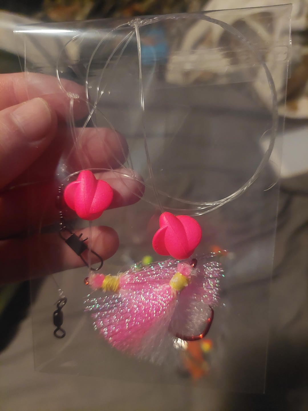 Just got back in to fishing recently and have been going surf fishing with my dad. I looked in to how to tie pompano rigs recently and it was simple enough that I gave it a shot but I had the idea to tie like a teaser skirt on the circle hook. Just because all I ever really see is the hooks with a float. Could be a good idea could be a terrible idea but I wanted to try. So I made 2 with and 2 without.