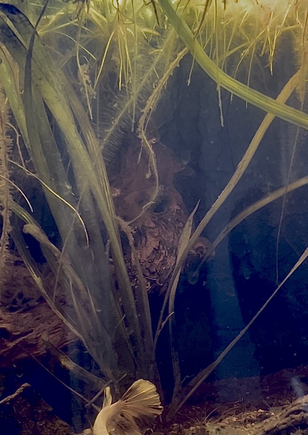 He seems to have settled in and found his spot among a small group of rocks, this morning when I turned the lights on I found him resting there. Most of today he has been moving sand in that area to his liking. He doesnāt stalk the shrimp anymore and only gets annoyed if they get too close to his rocks. He also seems to tolerate the guppy as well. She spent almost all day yesterday hiding from him and now she is out and about and occasionally tries to hang out near him. He doesnāt seem to like her but he doesnāt actively chase her away anymore and lets her do her thing near him.