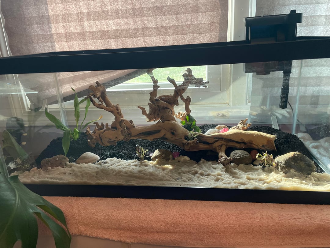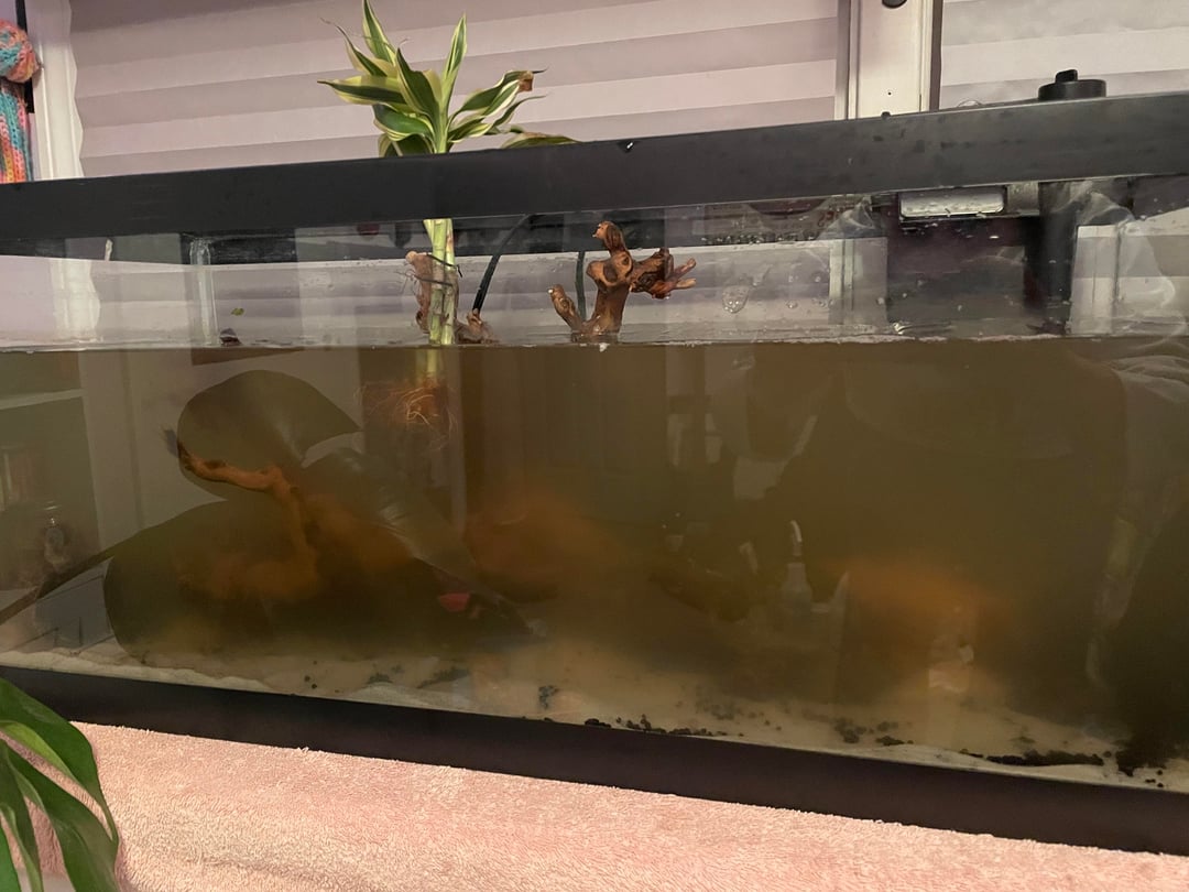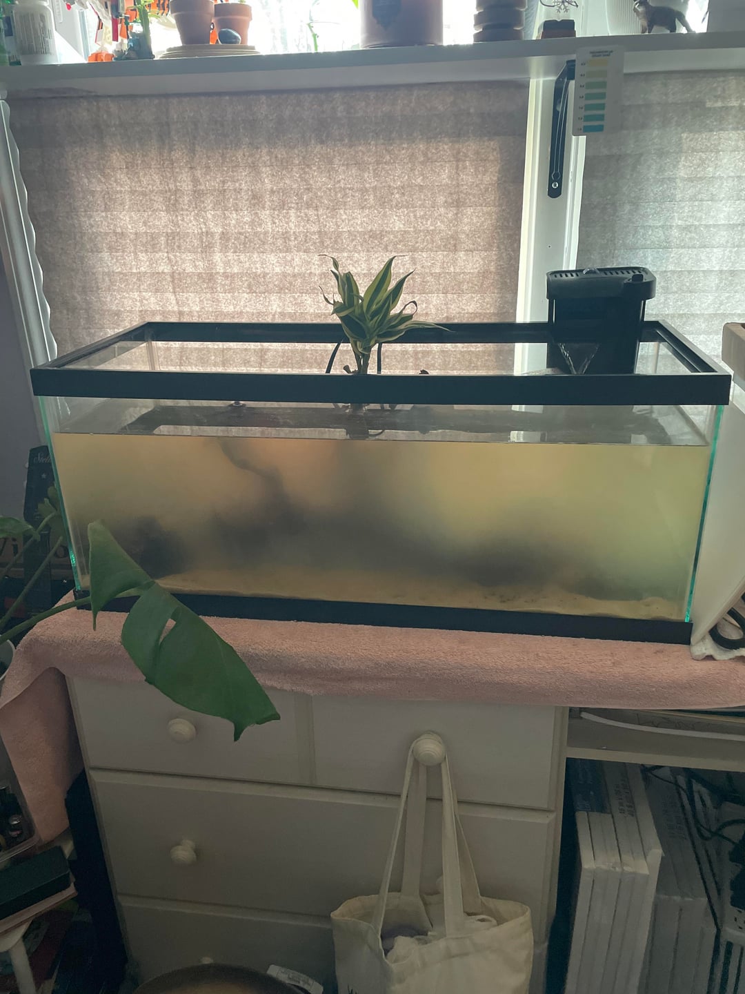 I set up this new 20g long. It started out with crystal clear water, I dechlorinated it with Prime, I rinsed all of the substrate, I used sand from my previous aquarium and the filter media from the previous aquarium for the beneficial bacteria.