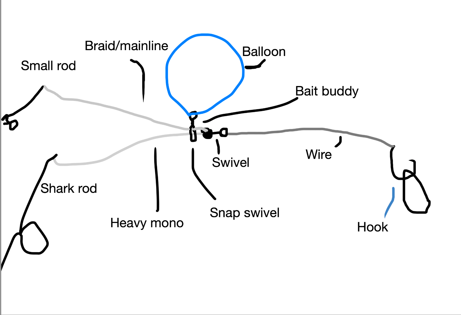 Do you think this rig would work? So i have the main rod with the shark rig, and then a light rod with the balloon, so that I can detach the balloon and sink the bait when its far enough, and then it will be able to be reeled back to me.