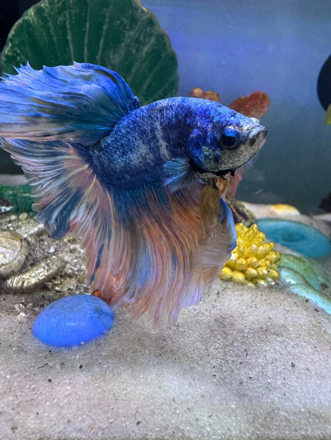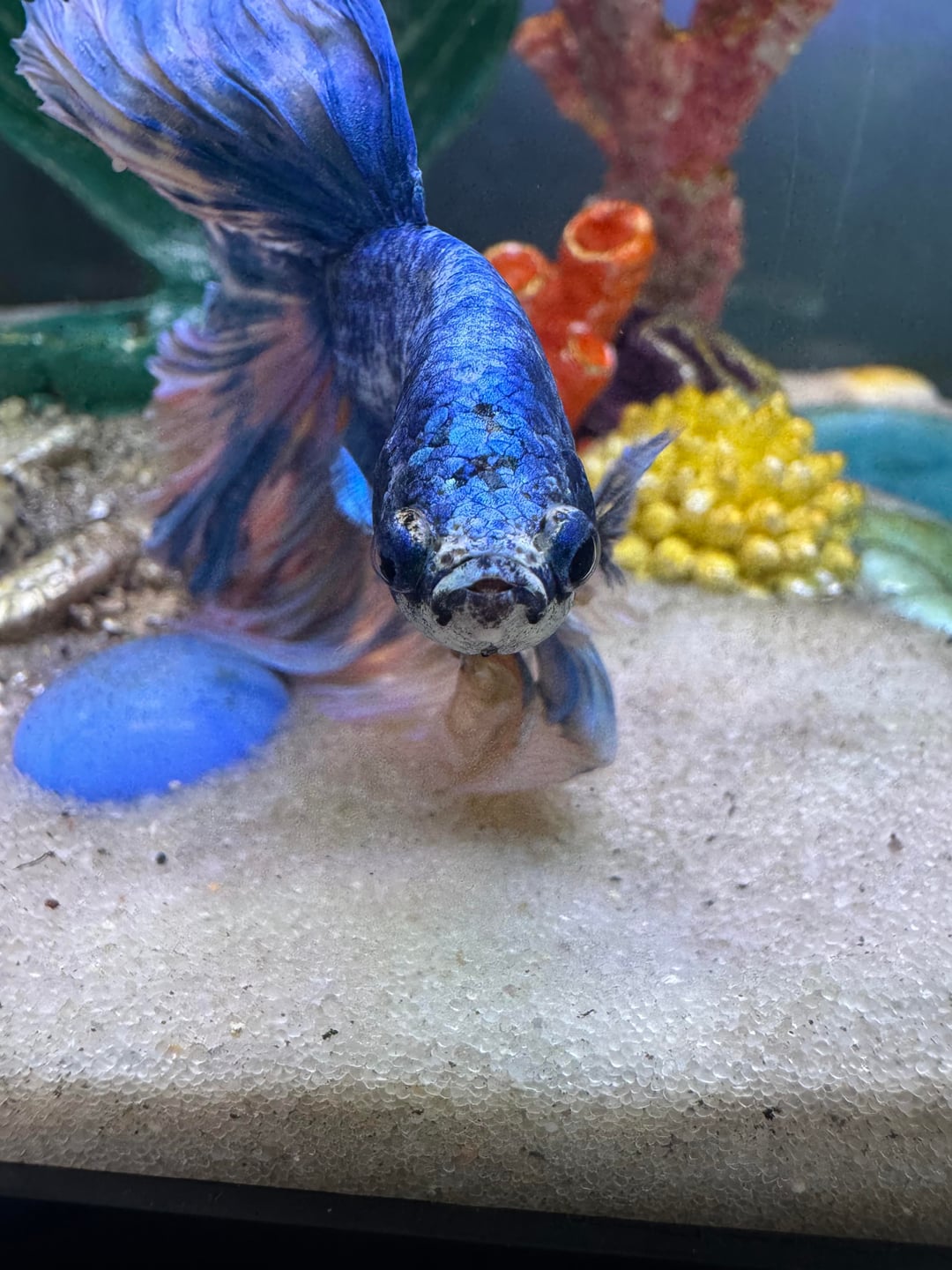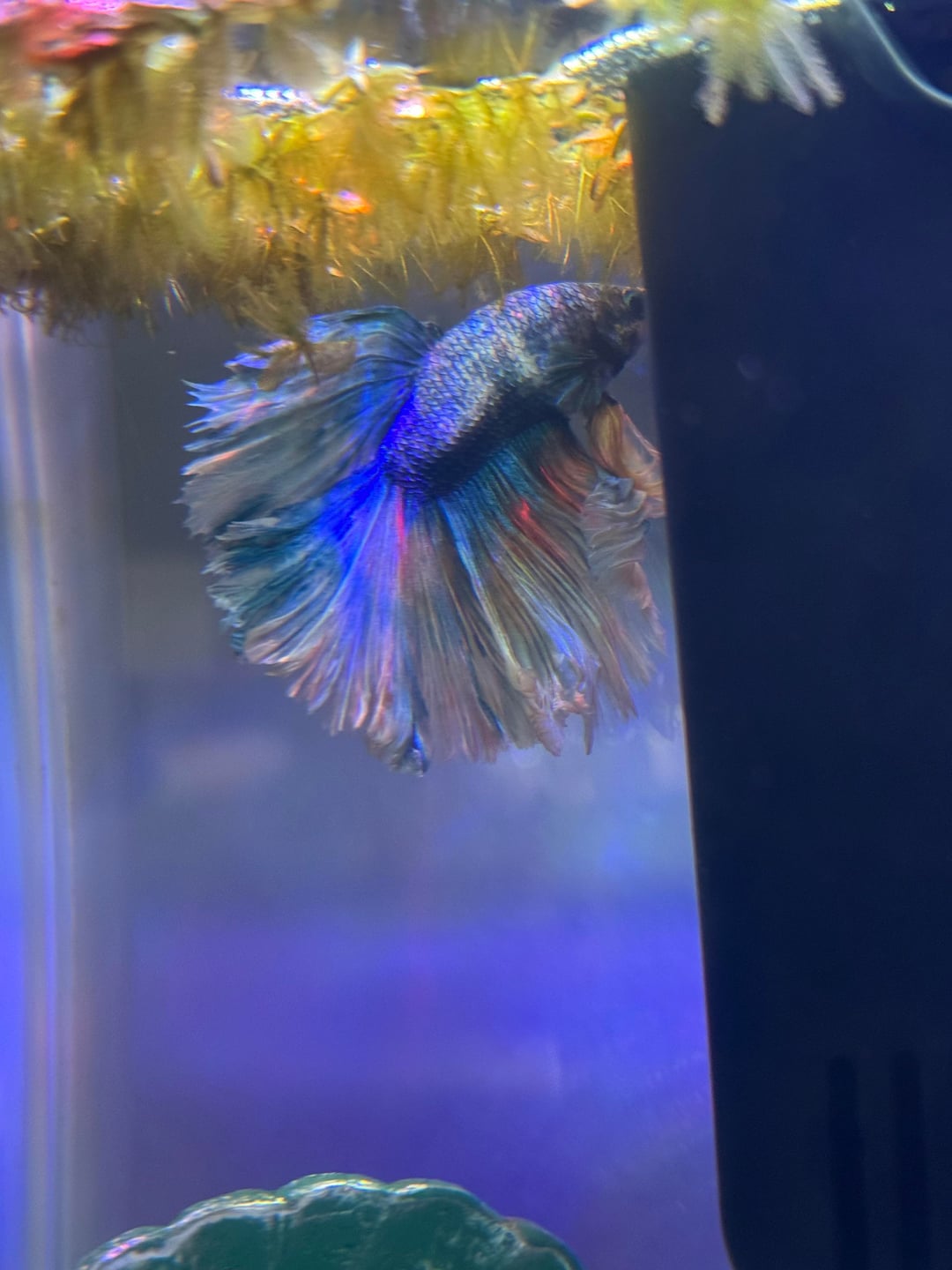 My sick betta passed today. He had been hanging on for so so long as I was medicating him but he was too weak. My boy Bluey lived a good life he was a beautiful happy fish who loved to swim up to me and hear me sing to him. In his last moments I sang to him too. Here are some photos of my beautiful fish in his glory days. I will always keep him in my memory as devastated as I am that he’s gone. I will never forget you fishy 💙