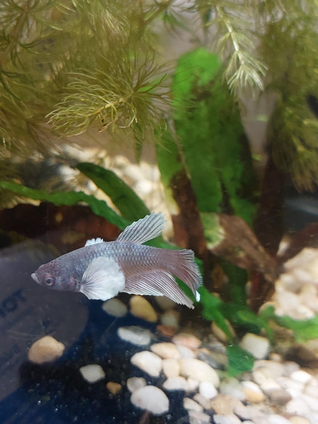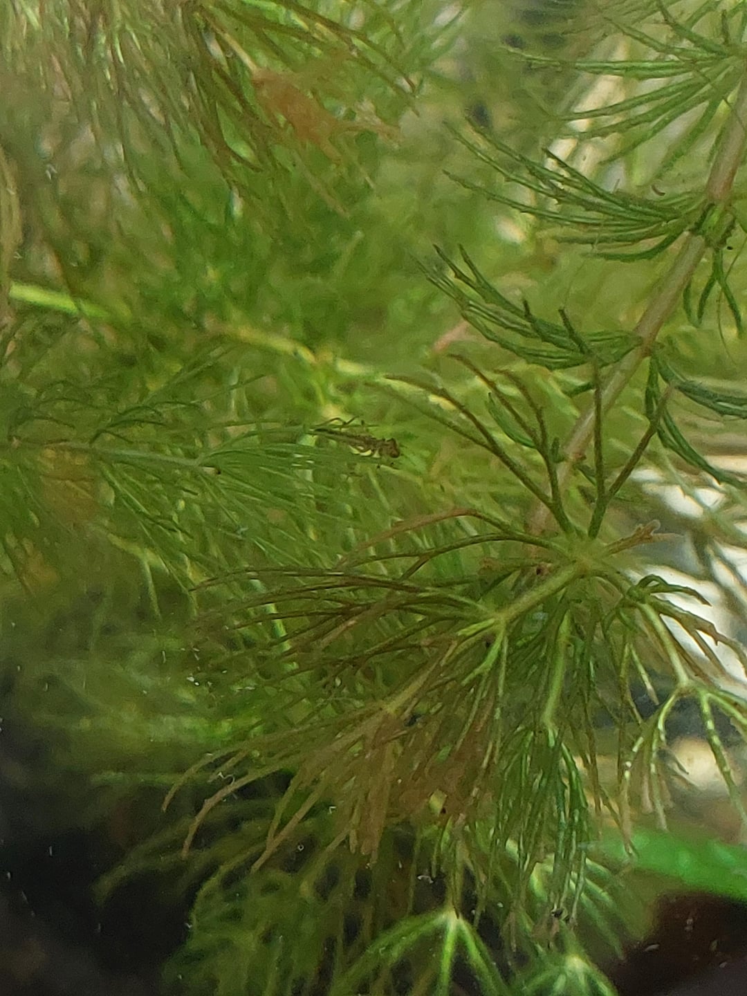 My Betta is about 2.5-3 inches long, she is generally pretty docile, we keep her with Ghost shrimp and some nerites for a clean up crew and she leaves them alone day and night from what ive seen (unless one of the shrimp dies), but i just added a chunk of hornwort in from a local store, and found this little dude hitchiked in.