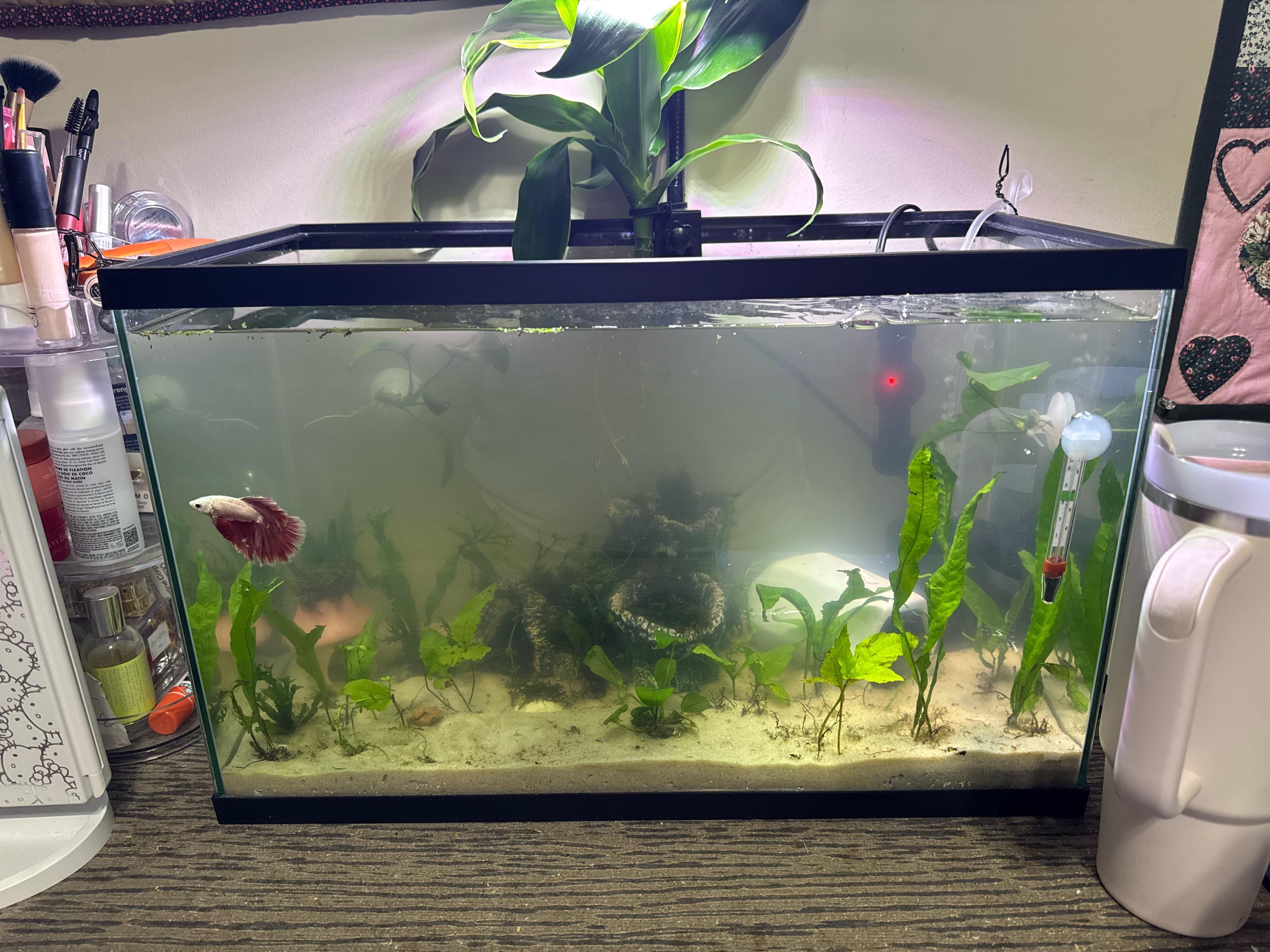 I’m sorry I’m new to fish keeping. I know there is not enough plants or hides. I have stuff coming in the mail and plan on buying over $50 worth of plants when I get paid tomorrow. I’m trying my best to give this dude the best life. The light does look bright in the picture but I promise you all that it’s not as bright in person. I’m using my plant that’s out of water to shade it.