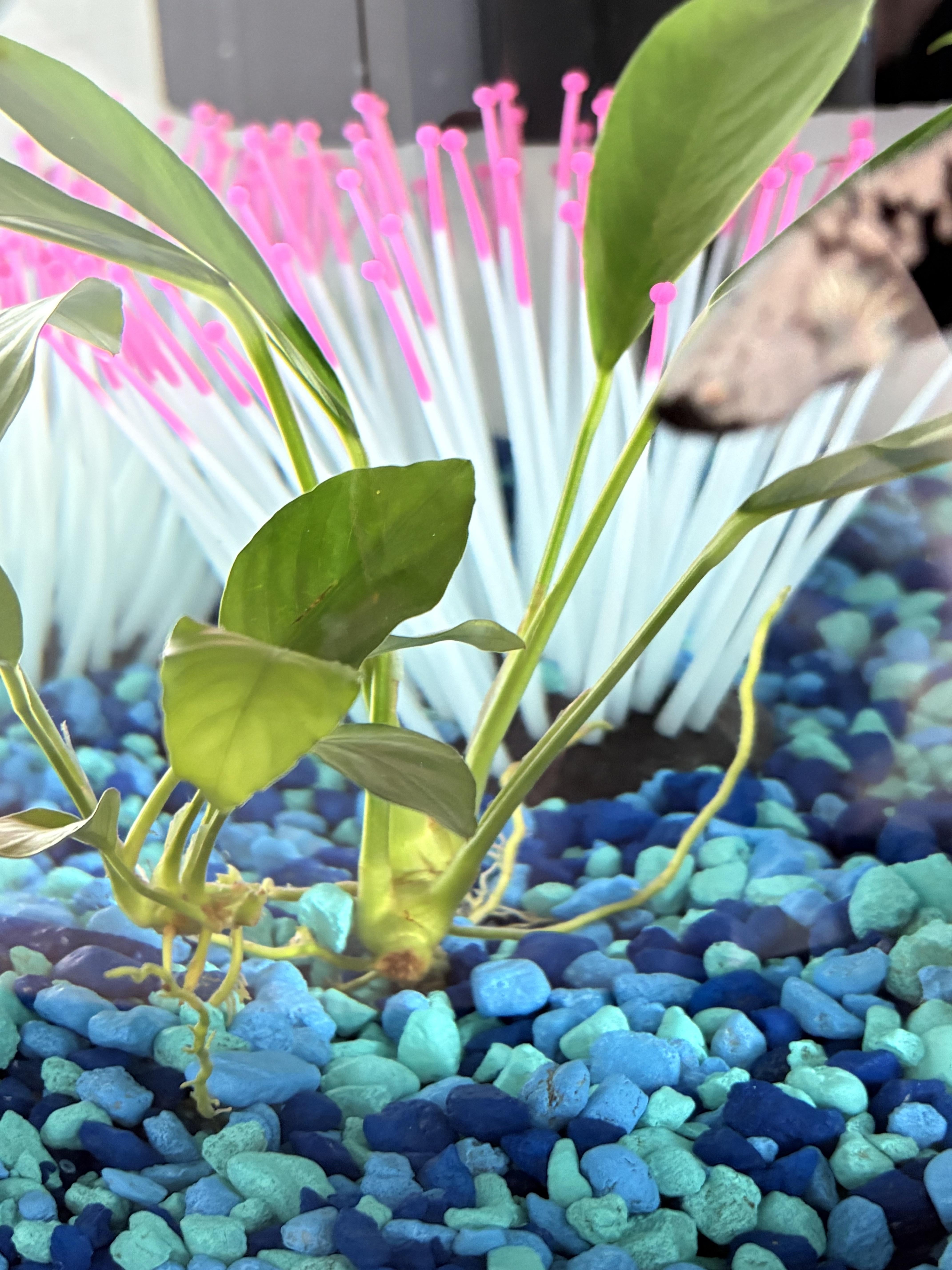 2. To add to what the other commenter said, this plant has a rhizome. The rhizome is the thick horizontal part that you have on top of your substrate. You can leave it like that as long as the rhizome is completely on top of your substrate, and just bury roots. If you’d like to “replant” it, the rhizome is what you’ll glue or wedge onto/into the hardscape (a decoration, piece of driftwood or a rock). If you need to go the glue route, I recommend Flourish Glue. I got it on amazon, but any cyanoacrylate adhesive works!! You will take the plant and decor out of the tank, put a small amount of glue on the rhizome and then stick it to the desired spot!!