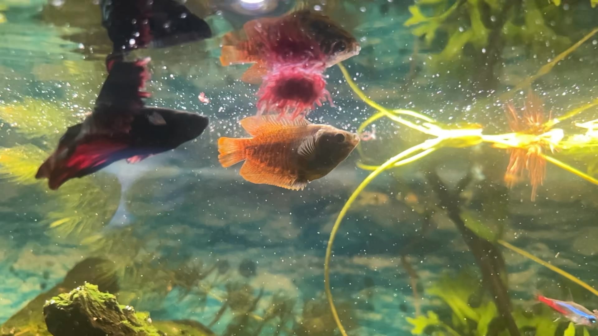 1. Nope, not with a gourami! This is extremely risky and irresponsible imo to even place them in the same tank and chance it at all. And if my eyes don’t deceive me, parts of his tail do look chewed on, though it’s hard to tell with the many folds.