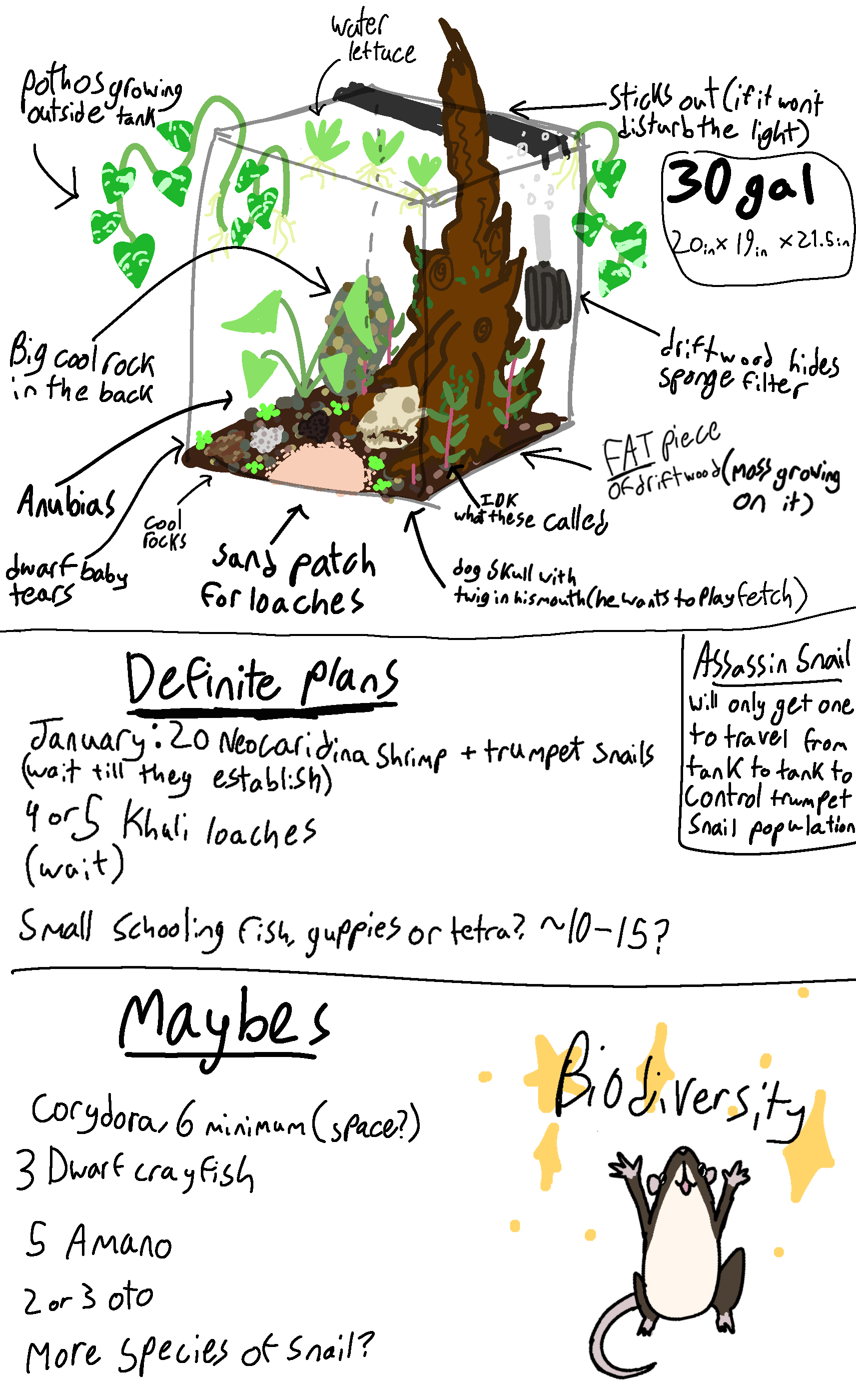 sorry i know this community is probably tired of hearing from me šš but i am excited about this and i want to share it. i'm prettty unhappy with how my 30 gallon looks right now. So i replanned it and then listed out everything i want to add! If anyone sees any issues that could come up or has any suggestions for this setup i would love to hear.