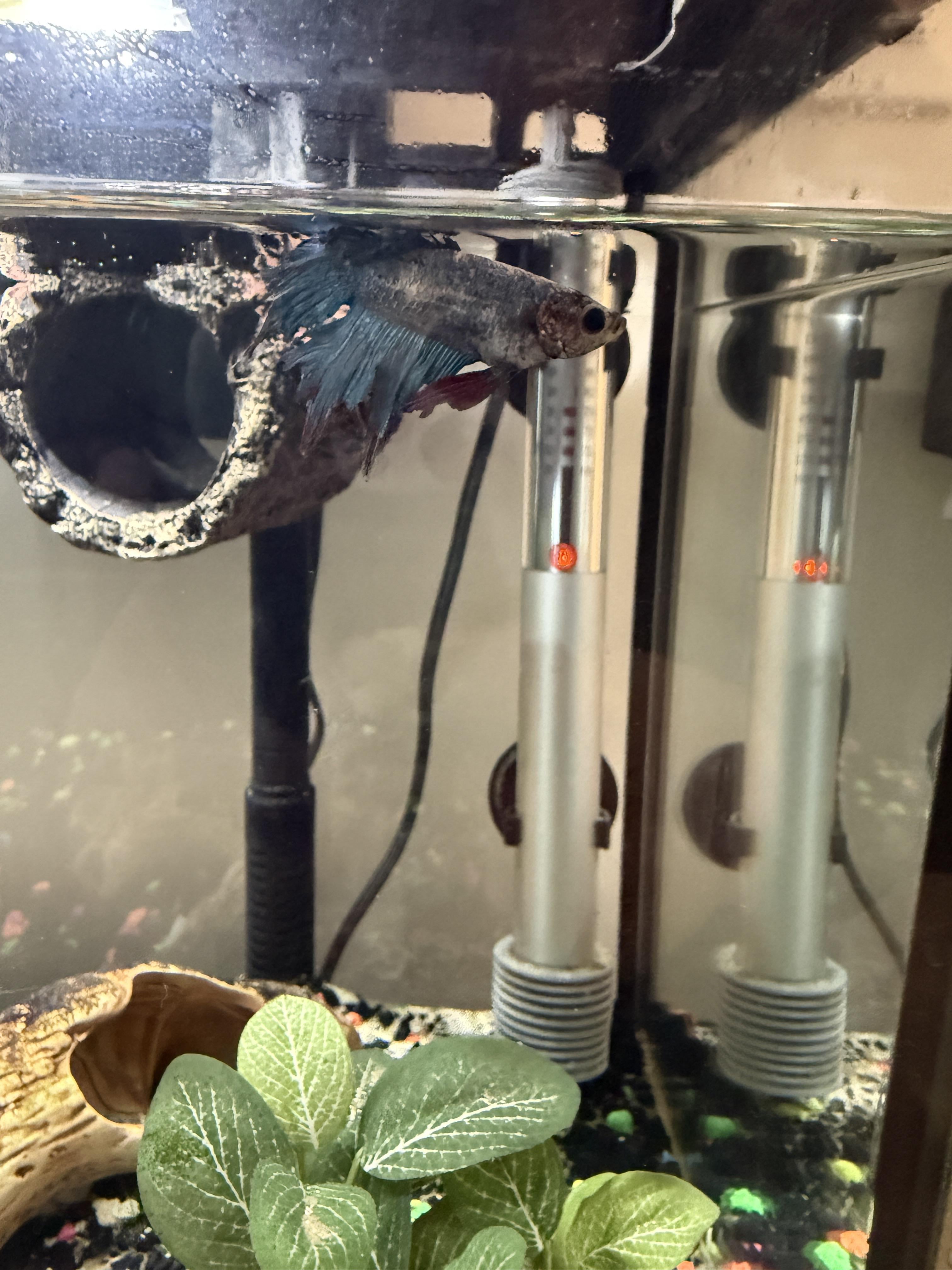This is Albert. For the past week or so he’s been hanging out around the waterline and doesn’t seem to be able to swim down. He also had a small lump protruding from one side. I fasted him for three days and fed him a pea, which made him poop a lot and now he’s much more active – but still not swimming down. This helped the lump and it’s gone now. He had a bout of fin rot a while ago and is slowly growing them back, plus has lost his colour off and on. Now I notice his belly is swollen and white. What do I do? Please help!