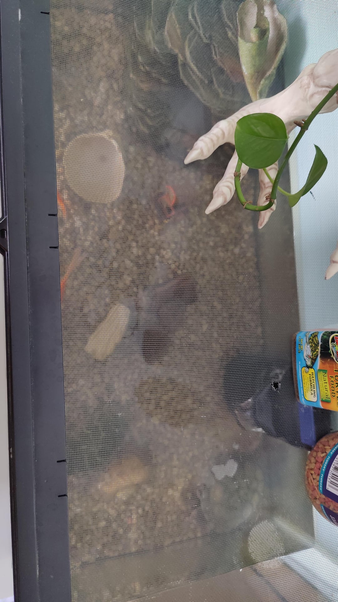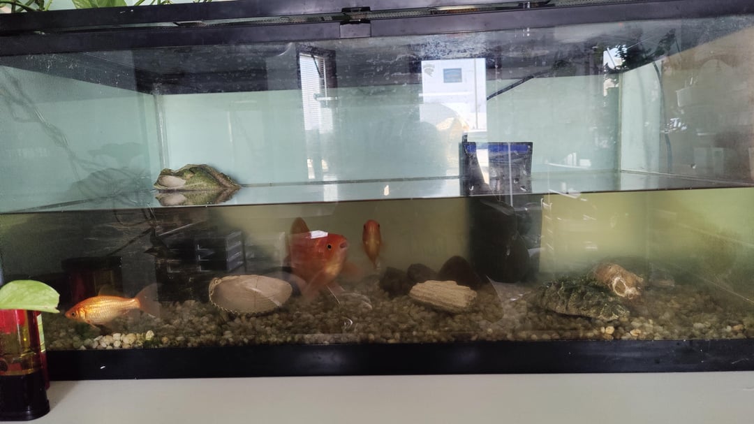 This is the fish tank at my work. I have asked about rehoming (owners said no), about separating them into different/bigger tanks (also a no), and I cannot take the fish and turtle myself, so I asked if I could take over their care.