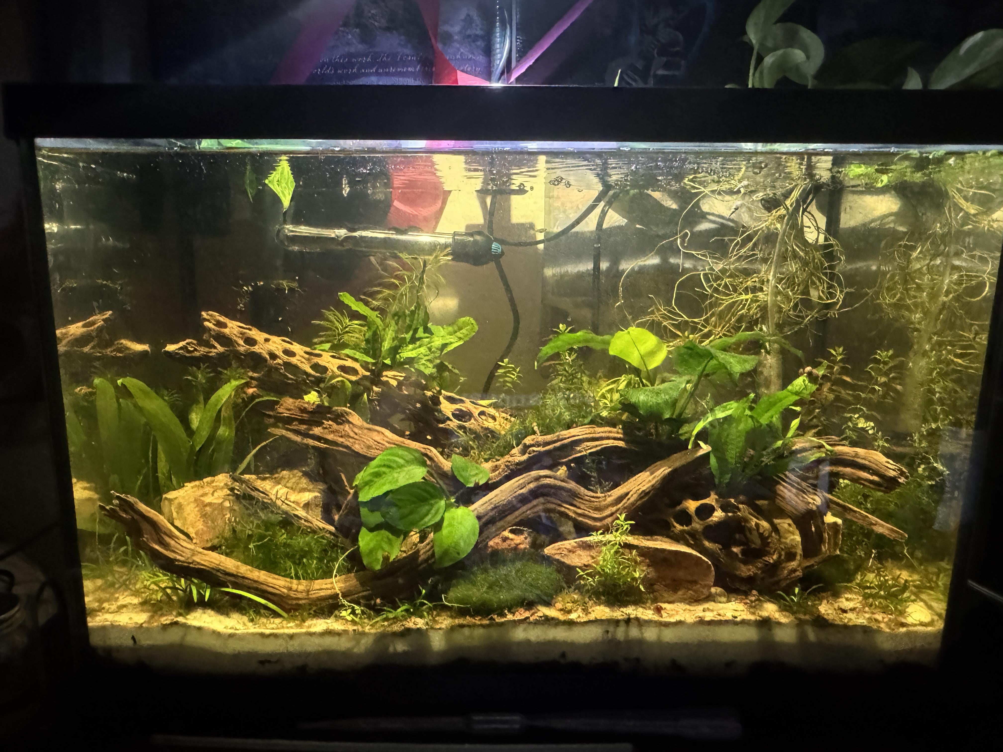 for context, it’s a 20 gal tank that’s been cycled with readable nitrates for 2 months now. My AZ tap water makes the water super hard and the pH is weirdly high for having lots of driftwood, like around 8. I’ve just recently added 3 feeder danios to get the tank used to livestock, but they’re still settling so I’ll wait on adding more fish. I have plenty of snails in the tank, but I still might add a few cherry shrimp eventually from my established shrimp tank. Can’t really tell in the photo but there’s tons background is full of stem plants that are starting to grow.
