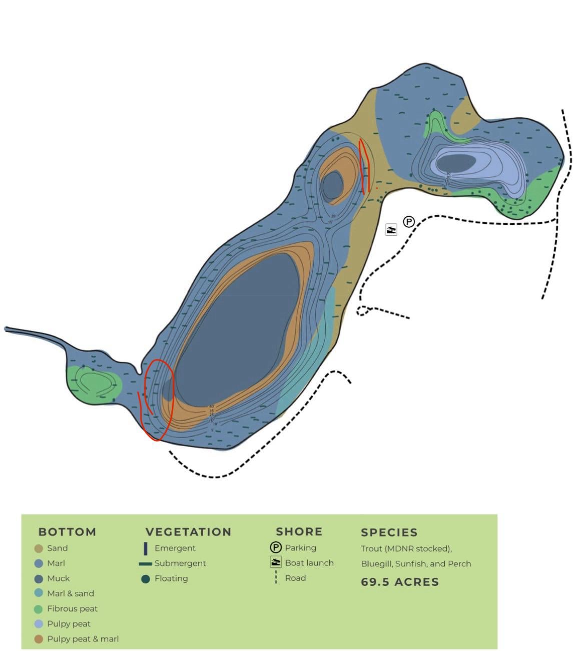 I am looking to fish this lake pretty hard this year starting in January. I would like to catch Rainbows, perch, and panfish. I think my best bet for all 3 would be in the two areas I have circled. Do these spots make sense, or will I have to rethink my plans? I know I have plenty of time to explore the lake but I am looking for a good starting point. Thanks!