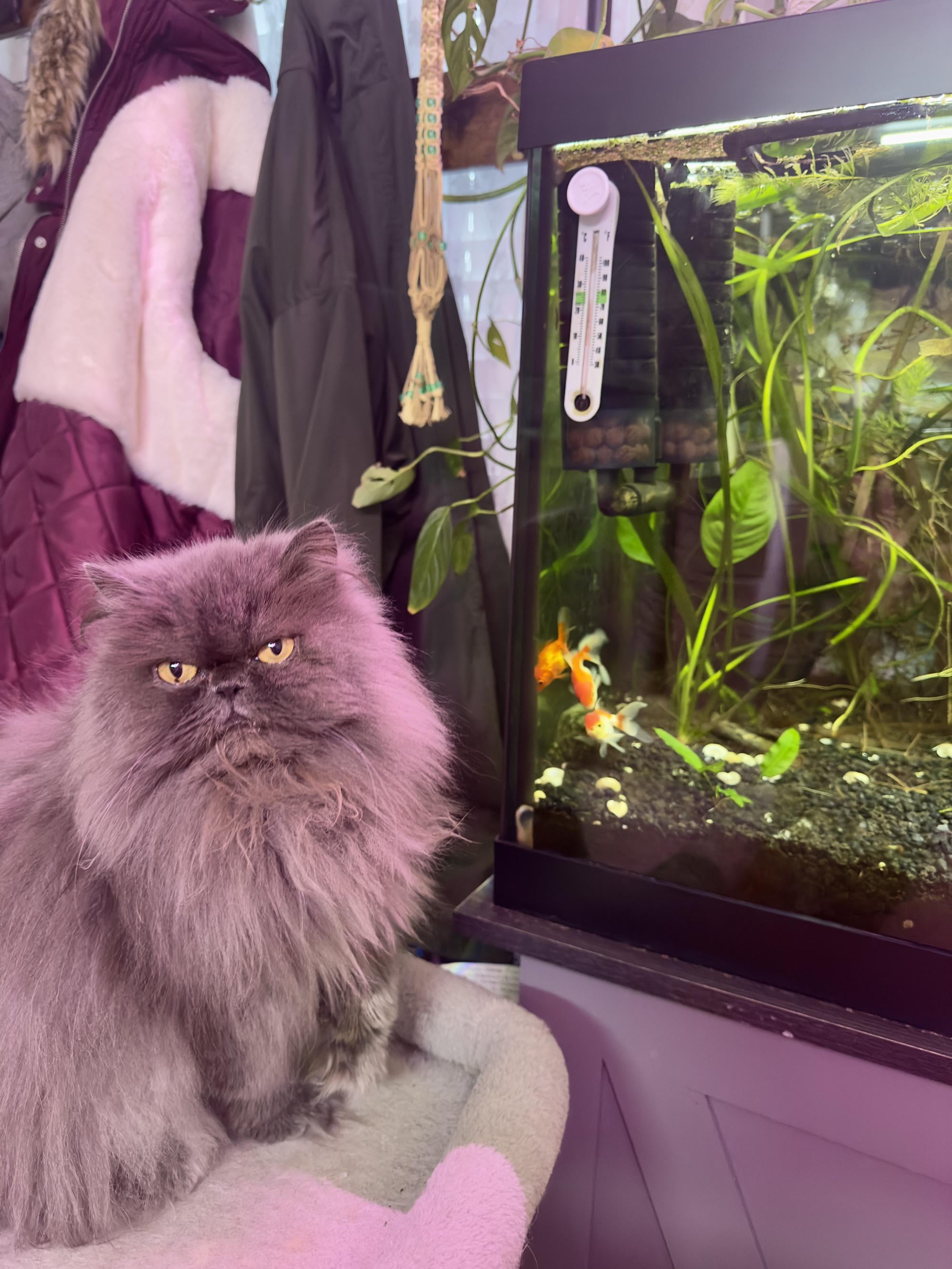 i put a little cat tree next to my goldfish tank and the cats and fish have become best friends! It’s cute how the fish will swim over and try to get their attention. Ft. my persian Poppy