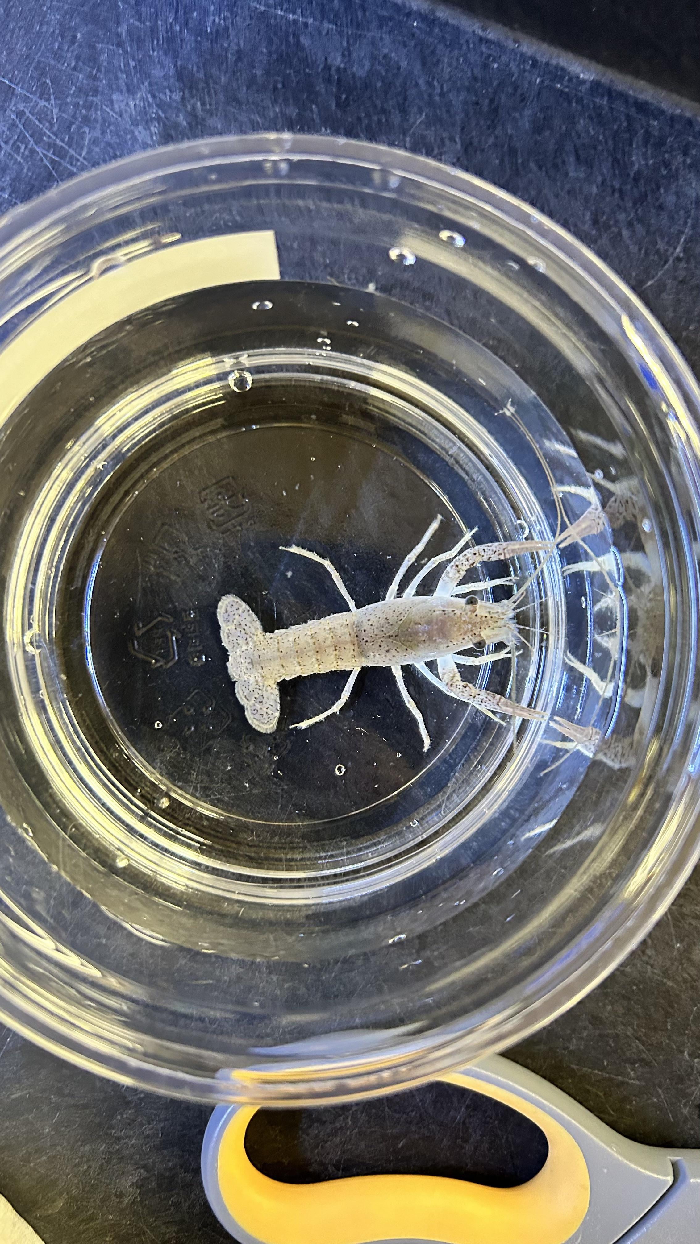 “That’s a juvenile crayfish (crawfish) — very likely a young white/ghost crayfish or a newly molted baby crayfish that looks pale and translucent.