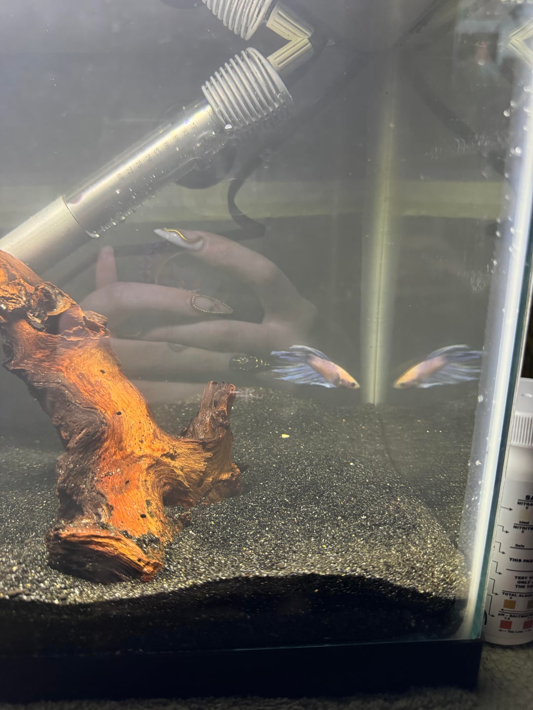 sunday had to run to petsmart for dog food and a snail for another one of my betta tanks, and of course as most do i stopped to look at the bettas they had just because why not. ended up seeing this guy in the cup, he was kinda floating on his side almost looked like he was ready to pass on and i just couldn’t pass up on him. his tank is a little bare at the moment because i am treating him for a few spots of fin rot and wanted to get him at least in a better environment. his 10 gal currently only has drift wood placed to make some hiding spots and a few lava stones until i can get plants and re-scape his tank. this is also my first time doing a fish in cycle so i pulled some established filter media from my other bettas tank and used that as the base along with using bottled bacteria, his water parameters are looking 10/10. he’s eating and his rot is looking better as well as him being curious and swimming around. i can’t wait to see his full transformation