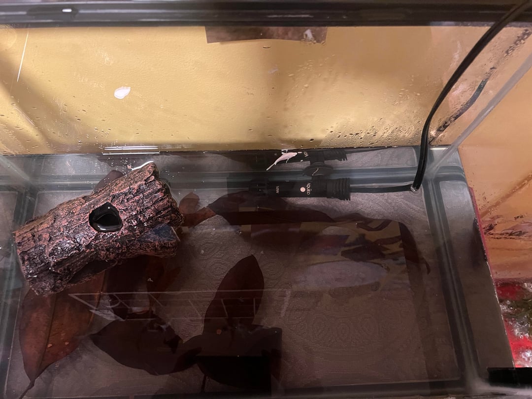 Tank photos attached, Aqueon 10g + Aqueon preset tropical heater (78f) with a floating log and magnolia leaves.
