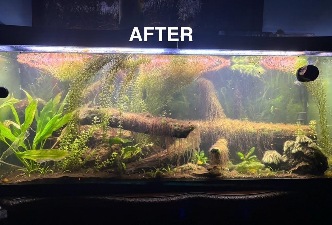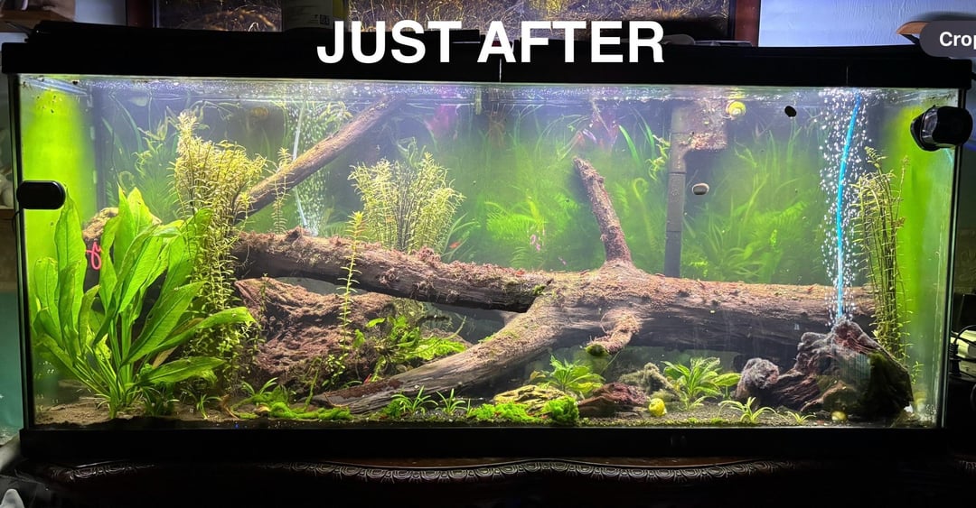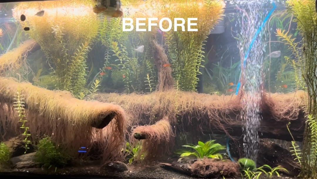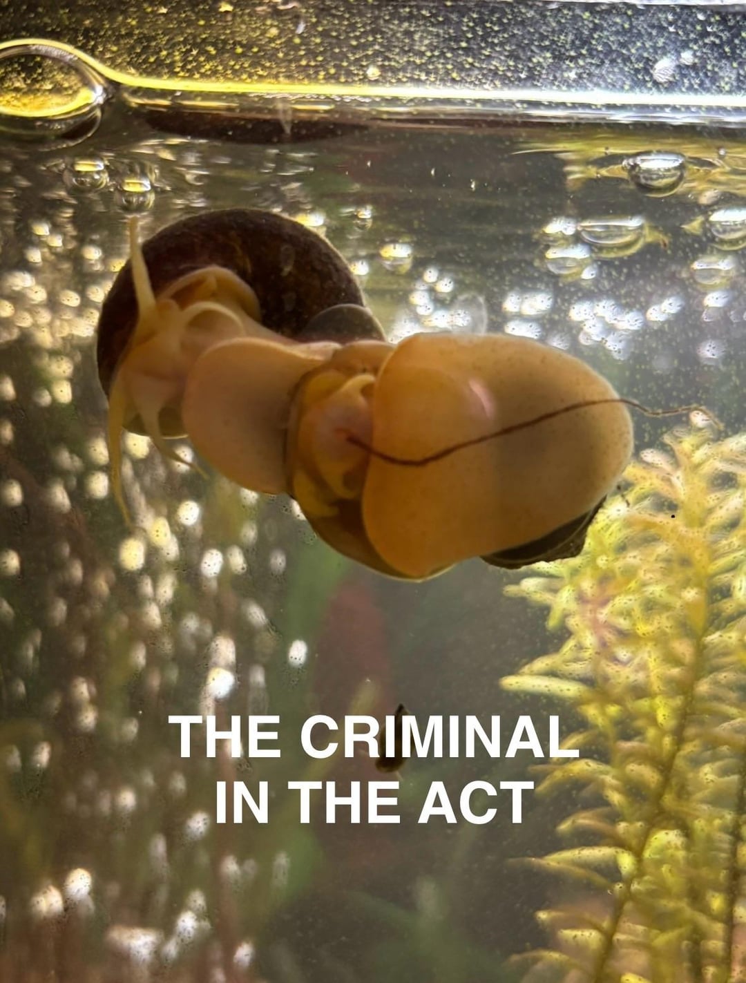 Backstory: I set up this tank a good few years ago. It’s a 55 gallon. To decorate it, I found some logs that had been cut up from an oak tree that fell in our front yard after 2017’s Hurricane Irma. They were perfect, as they’d been sitting in the sun for a few years and were nice and dry. I couldn’t fit them in the oven or in a pot to boil so I just repeatedly boiled water and poured it over them in the bathtub. I soaked it overnight for a few nights to get the excess tannins out. Obviously as my sanitization process wasn’t perfect, I ended up with a surprise. A really cool and rare red algae, Thorea hispada. Looks like brown spaghetti. I’ve taken a lot of pride in it over the years (and I’ve even sold it) so this Mystery Snail experience was a roller coaster for me.
