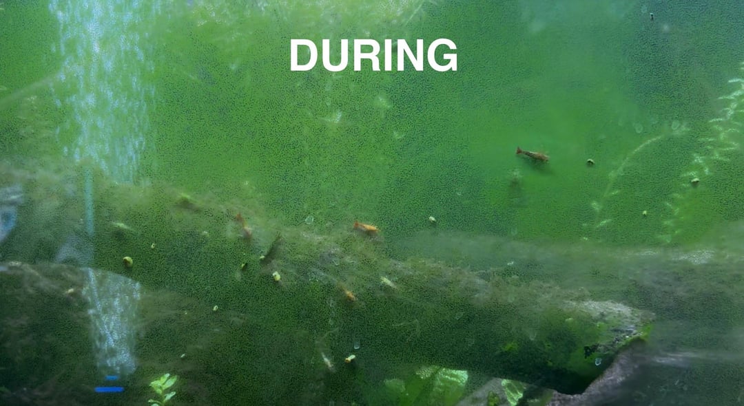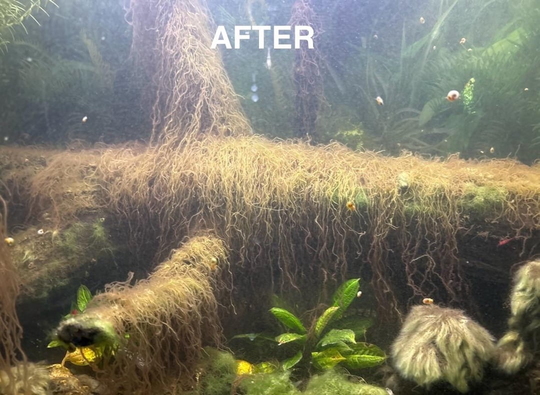 I didn’t notice at first. It was slow. I had to feed the Mystery Snails a LOT. They produced a lot of waste and I had to put a lot of food in. Slowly my glass became covered in green algae (which really annoyed me, as the tank had been pristine for years) and MY THOREA HISPADA WAS DISAPPEARING. Eventually I found the little criminals slurping up my brown spaghetti as they cruised along. They were destroying my good algae and introducing bad algae! As you can see in the “just after” photo, they ate almost all of it.