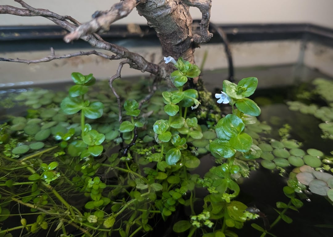 Maybe this is common knowledge but I didn't know they could poke up like this and bloom! 10gal dirted blackwater tank with betta, breeding population of dwarf rabora, otocinclus, and ramshorns. Other plants are dwarf sag, vallisneria, water sprite, seusswassertang, java fern, java moss, salvinia, red root floaters, and a pothos out the back. Established about a year ago.