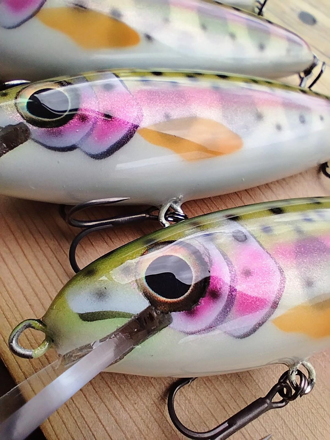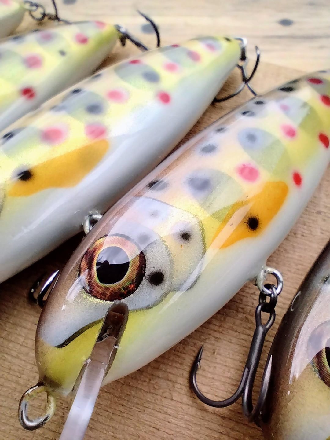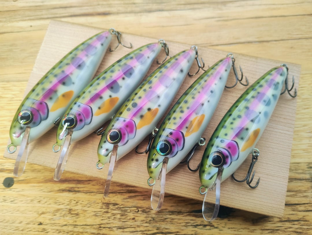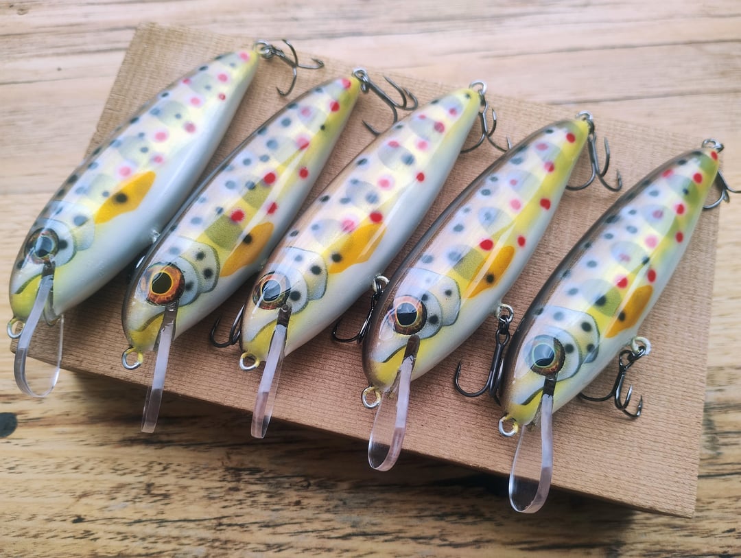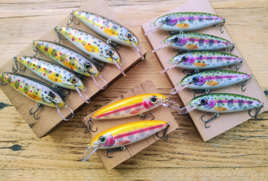 I made some trout lures. These are carved from cherry wood, and painted in juvenile rainbow, brown and lightning trout patterns. Posted by Snowy_Nimbus